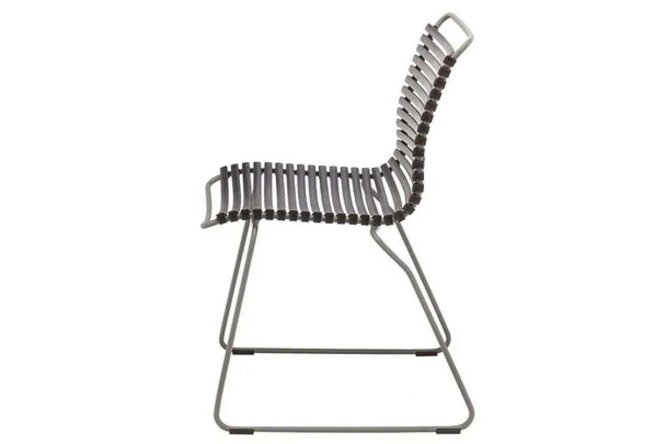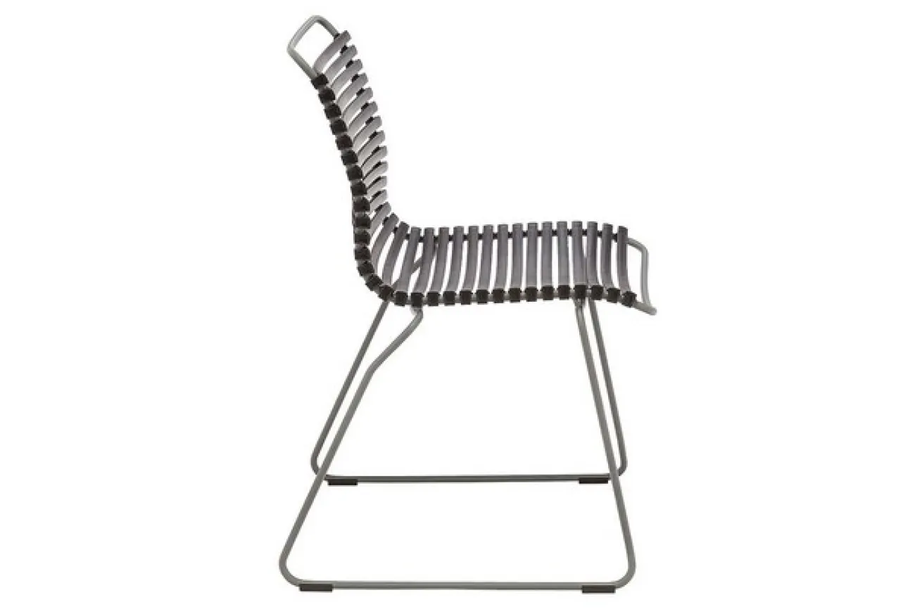Der körpergerecht ausgeklügelte Gartenstuhl „Click“ des Labels Houe fasziniert mit bunter Optik und schlanker Formensprache.Sitz sowie Lehne bestehen aus durchgehendem Kunststoff. Die einzelnen Lamellen haben genügend Abstand zueinander, so dass sie aussehen wie Rolladen-Lamellen, durch die man hindurchschauen kann. Allerdings dient diese Aufmachung hier nicht zum Stalken, sondern für das Regenwasser, das hindurchfließen kann. Befestigt auf und getragen wird das Ganze von einem grauen Metallgestell, dem zwei Beine entspringen, die trapezförmig angeordnet sind. Dadurch sieht der Stuhl nicht aus wie ein normaler Gartenstuhl, sondern hat ein besonderes Design und wird in modernen Gärten zum echten Hingucker. Sie können zudem die Stühle bei Nichtgebrauch raumsparend stapeln.