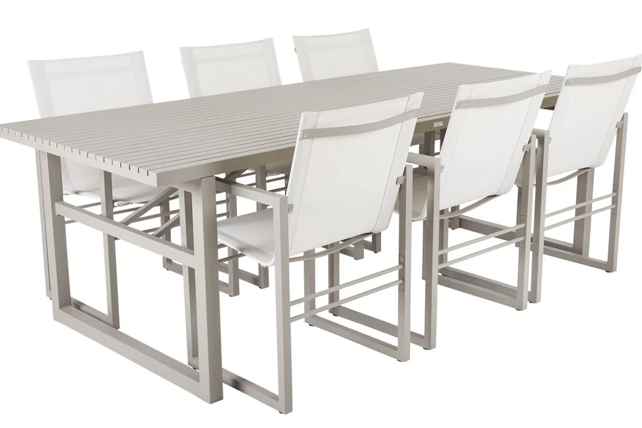 In der Frühlings- und Sommerzeit wird das Innere des Hauses nach draußen gestülpt, daher muss auch die Terrasse wohnlich und einladend aussehen. Dazu gehört auch der Outdoor-Tisch, an dem sich der ganze Tag beziehungsweise Abend abspielt. Wie wäre es mit einem farbenfrohen Bouqet in einer robusten Vase, die zum modernen und doch schlichten Look des Terrassentisches aus Aluminium mit grauer Pulverbeschichtung passt? Auch wenn das Möbelstück auf den ersten Blick scheint, als lasse er sich einklappen: tut er nicht. Dennoch passt er sich dank seiner eher neutralen Farbe in die Umgebung an. Ein kalter Kaffee und das liebste Magazin vor der Nase, so lassen sich die ersten warmen Sonnenstrahlen an Vevi genießen. Aber Vorsicht: Da die Tischplatte aus einzelnen Aluminium-Lamellen besteht, könnte die Zeitschrift durchfallen. Nur ein kleiner Scherz!