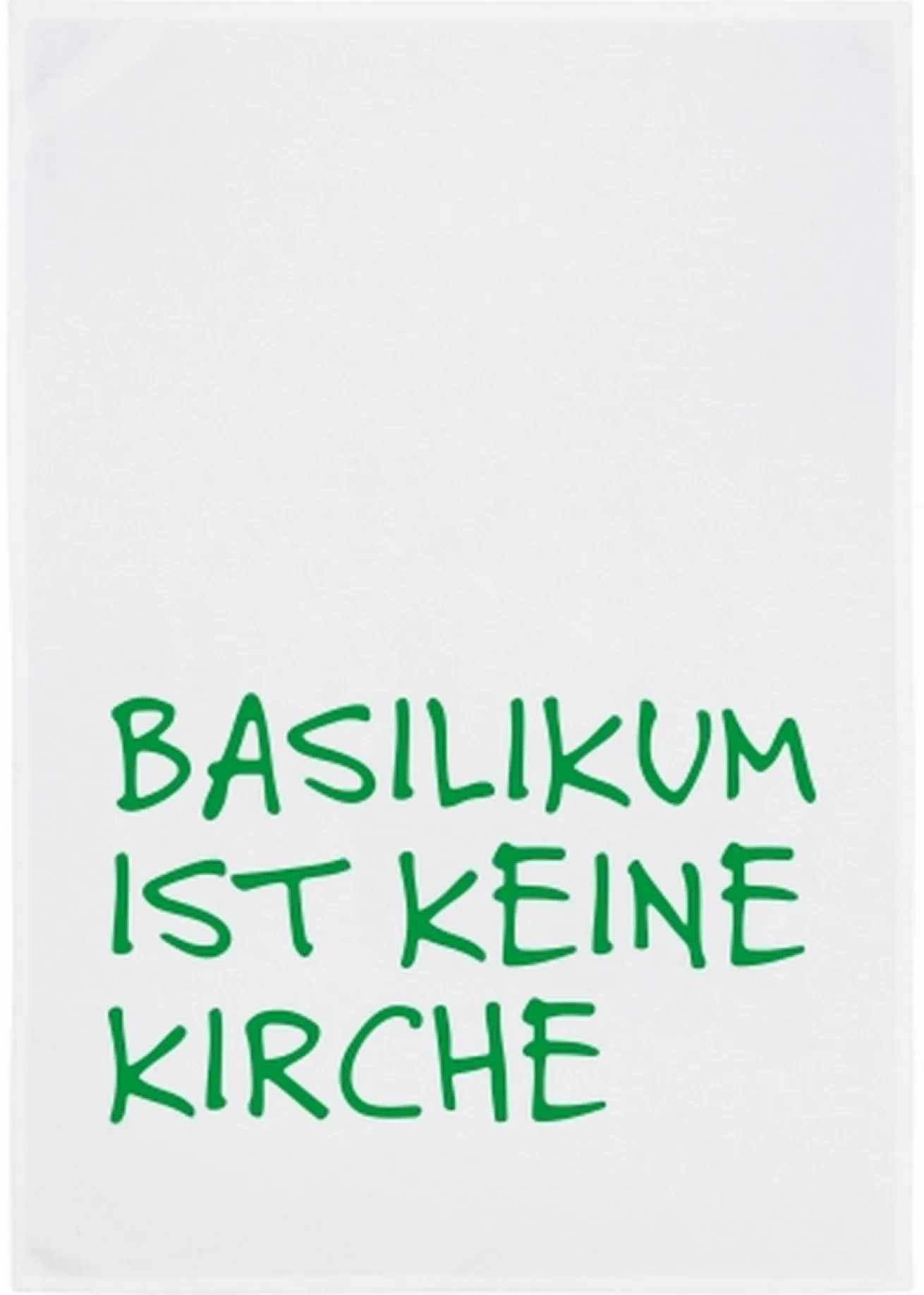 Ein Küchentuch für alle, die Basilikum mit Basilika verwechseln. Der 70cm breite und 50cm tiefe Stoff aus weicher Baumwolle ist ein tolles Geschenk. Weißer Hintergrund und grüne Schrift, die zum Basilikumkraut passt. Was möchte man mehr?