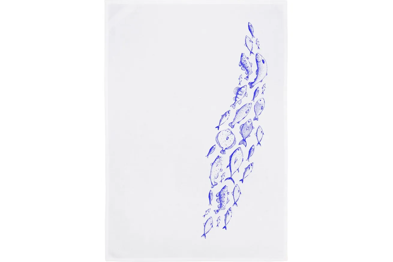Für alle Fischfans und Meereslover haben wir das perfekte Geschenk: Ein Handtuch zum Abtrocknen von nassem Geschirr in Weiß mit einem Fischschwarm in Blau.