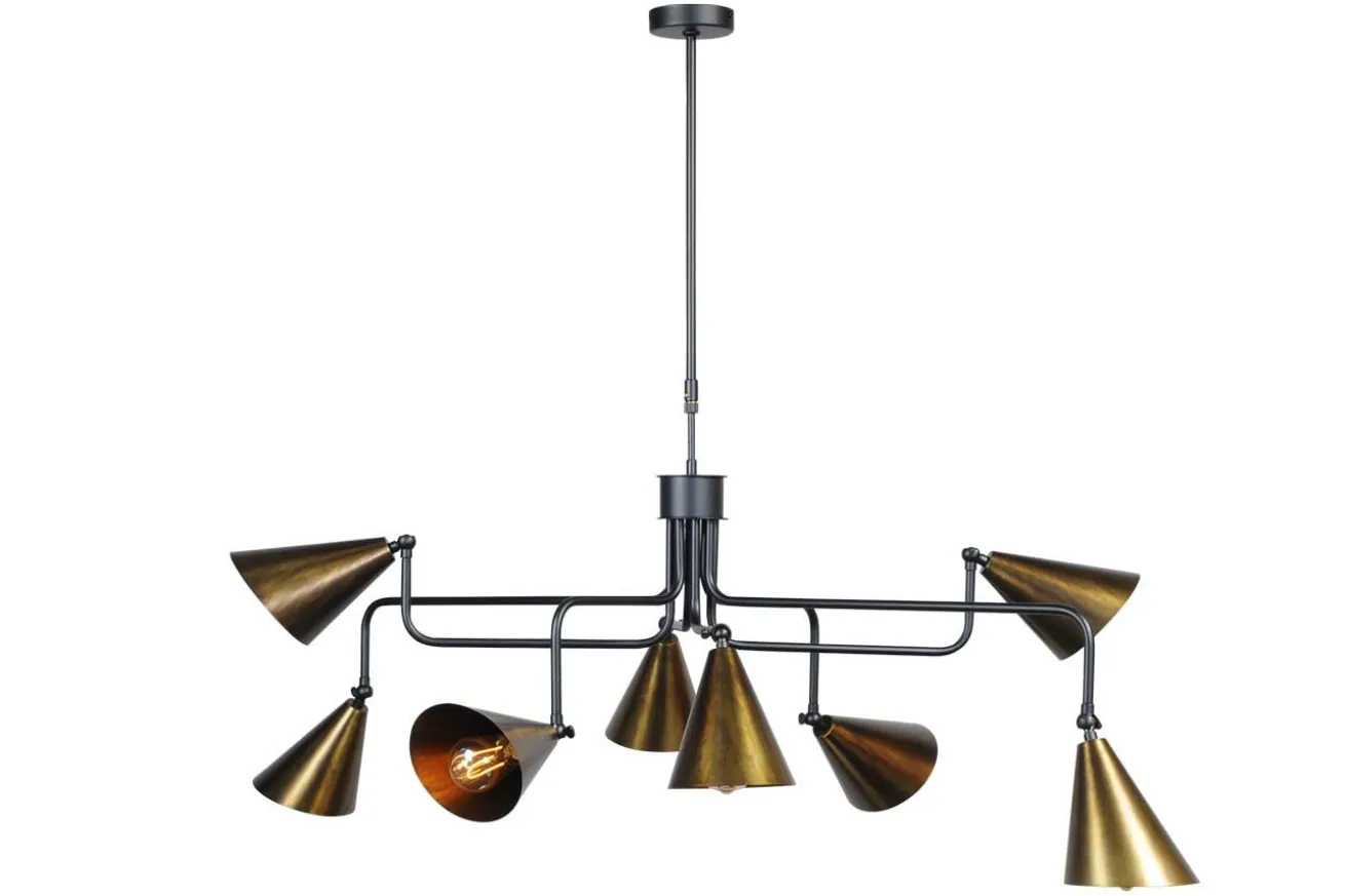 Die Pendelleuchte im Industrial Look überzeugt durch die im antiken Messinglook gefertigten 8 Schirme. Diese haben einen Durchmesser von 15cm, während sich die Breite der Pendellampe auf 148cm beläuft. Sie passt vor allem über massive Vollholztische mit breiten Messingfüßen besonders gut.