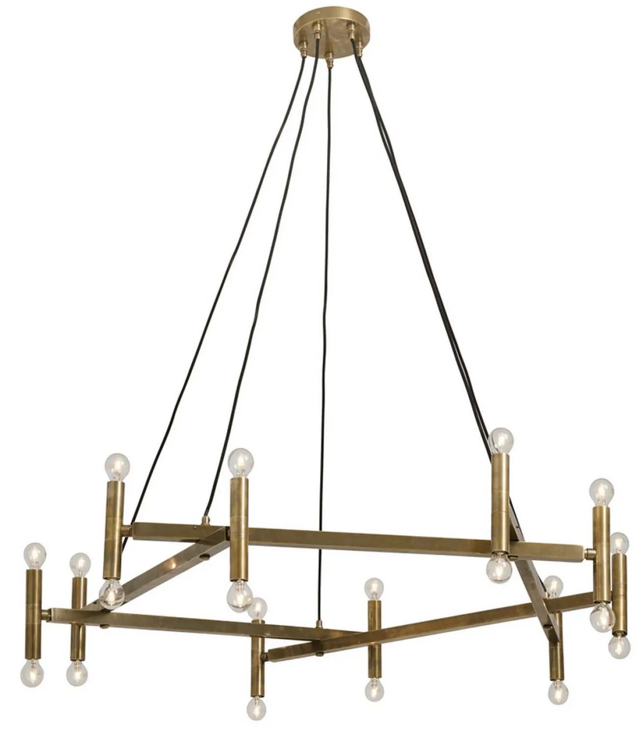 Wenn man einen Blick auf diesen Kronleuchter wirft, fühlt man sich im ersten Moment ins Mittelalter zurückversetzt: Einzelne Messingstreben, die im Quadrat miteinander befestigt sind, an deren Enden längliche Lichtkolben stramm stehen. Ein extravaganter Look, der in jede noch so moderne Einrichtung einen Stilbruch bringt und gleichzeitig doch irgendwie hineinpasst. Jene breite Pendelleuchte, die eher ein Kronleuchter ist, hat eine Breite und Tiefe von je 142cm sowie eine Höhe von 120cm. Herausragend eignet er sich daher über lange Speisetafeln aus Massivholz, die in Kombination mit der Lampe dem Esszimmer etwas Anmutiges, gar Königliches verleihen.