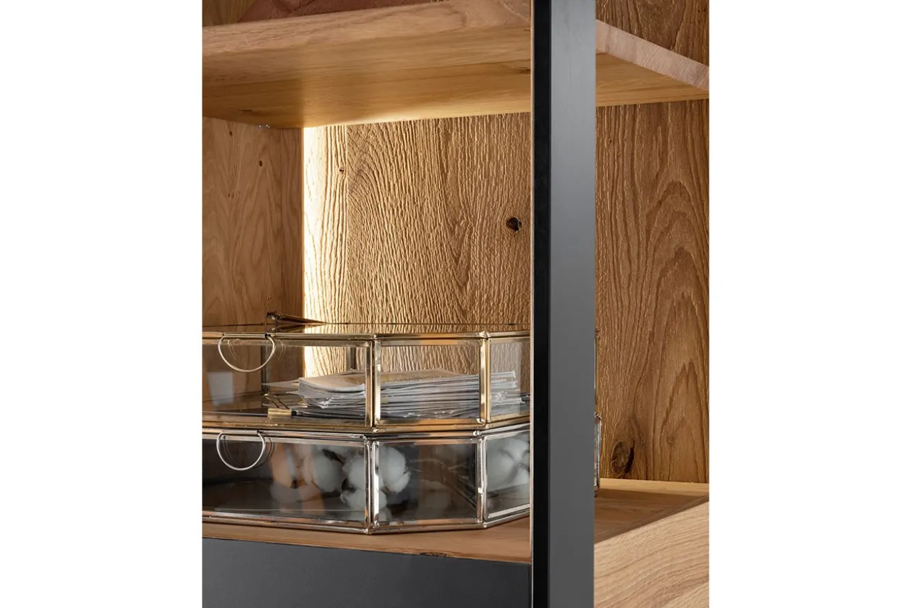 Für das im modernen Landhausstil eingerichtete Wohnzimmer fehlt die passende Vitrine? Wie wäre es mit Benni, dem Vitrinenschrank, der durch seine natürliche Farbe mit gleichmäßiger Maserung und geölter Oberfläche hervorragend zu Ihnen passt? Dieses kastige Möbelstück besteht aus Wildeiche, welche sich durch stark ausgeprägte Wuchsmerkmale wie Astlöcher und Harzkanäle auszeichnet. Da schlicht jeder kann, ist hier der Clou: Während eine Seite komplett mit einer undurchschaubaren Tür bestückt ist, wohinter sich Dvds, Cds und andere Gegenstände, die gerade nicht benötigt werden, verstauen lassen, wurde die obere linke Hälfte mit einer Tür versehen. Diese werden von einer integrierten Beleuchtung angestrahlt und stehen so im Scheinwerferlicht. Dahinter befinden sich drei Einlegeböden zum Präsentieren von wertvollen Erinnerungen oder Dekoobjekten. Mit dem schwarzen Akzent wird Vitrine von Schrank getrennt, nimmt jedoch nichts von der Rustikalität des Schranks weg.