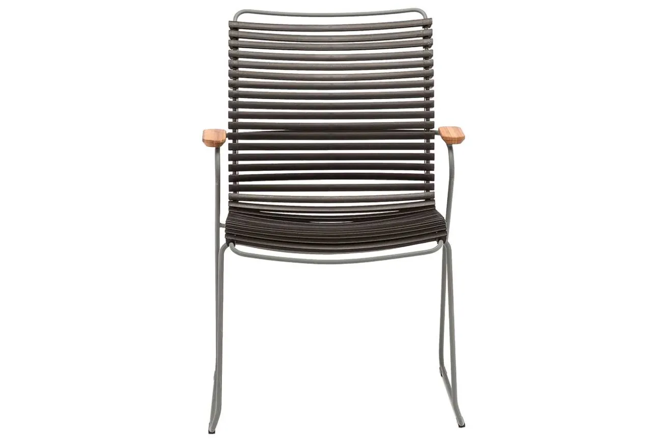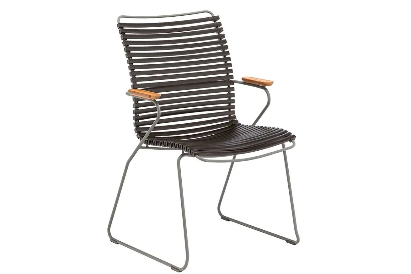 Der körpergerecht ausgeklügelte Hochlehner Click des Labels Houe fasziniert mit bunter Optik und schlanker Formensprache. Dank der hohen Rückenlehne und nützlichen Armlehnen offeriert er erstklassigen Sitzkomfort und Sie können zudem bei Nichtgebrauch raumsparend stapeln. Das schlichte Metallgestell ist aus pulverbeschichtetem Stahl hergestellt. Ein Material, das sehr wetterbeständig und haltbar ist. Die Sitzfläche setzt sich zusammen aus verschiedenfarbigen Kunststoff-Lamellen, die dank eines außergewöhnlichen Clicksystems nach Lust und Laune ausgewechselt und neu zusammengesetzt werden können.