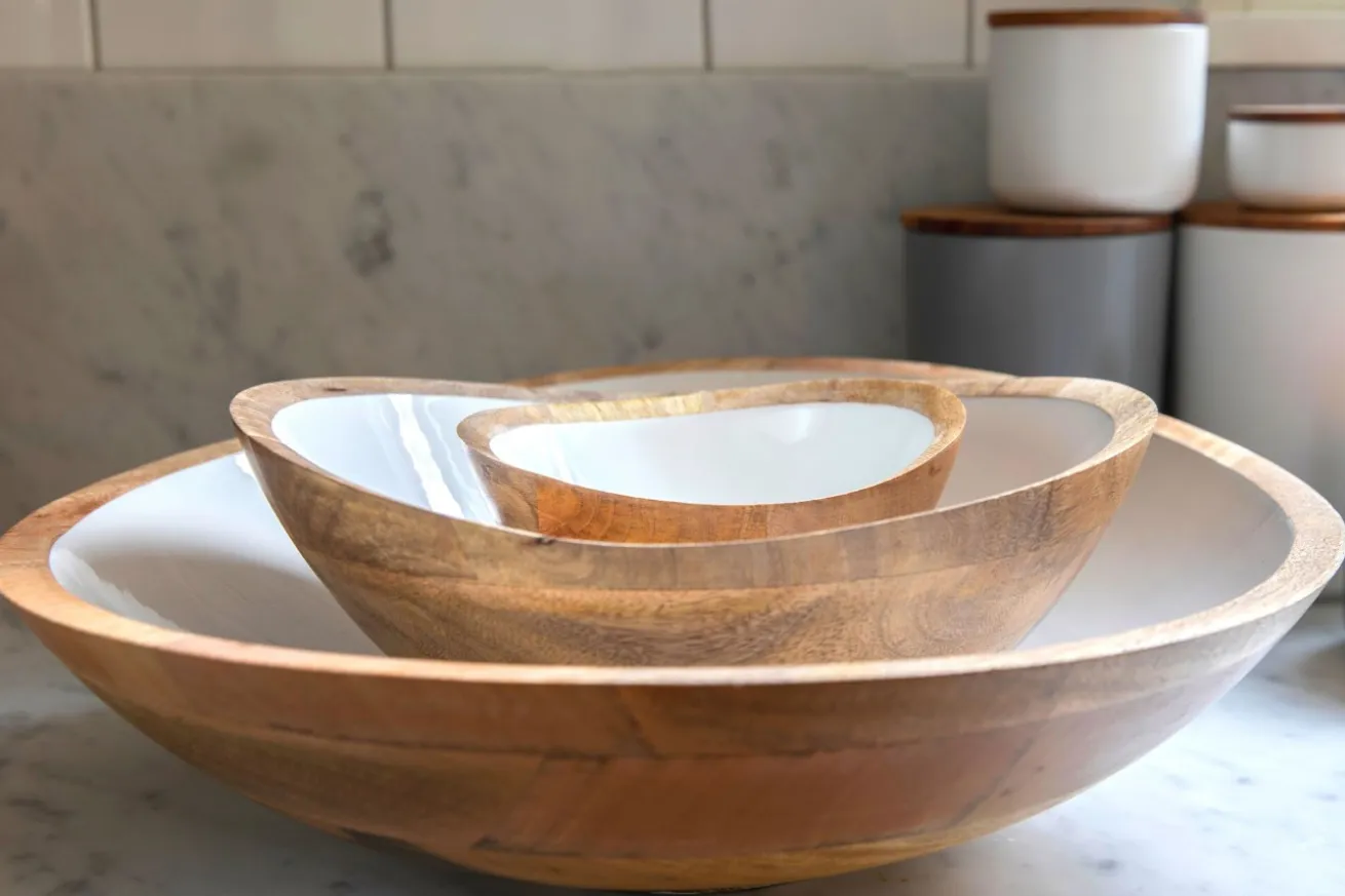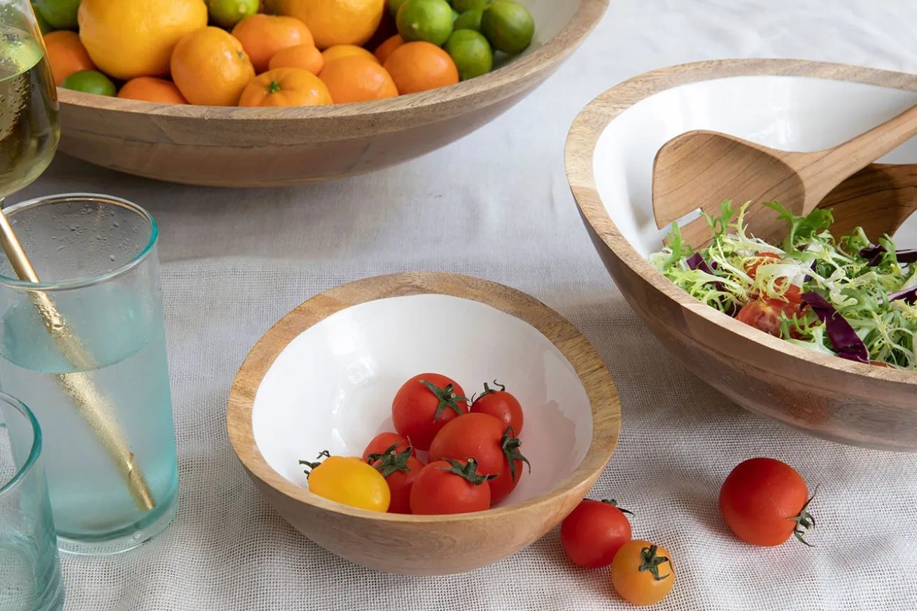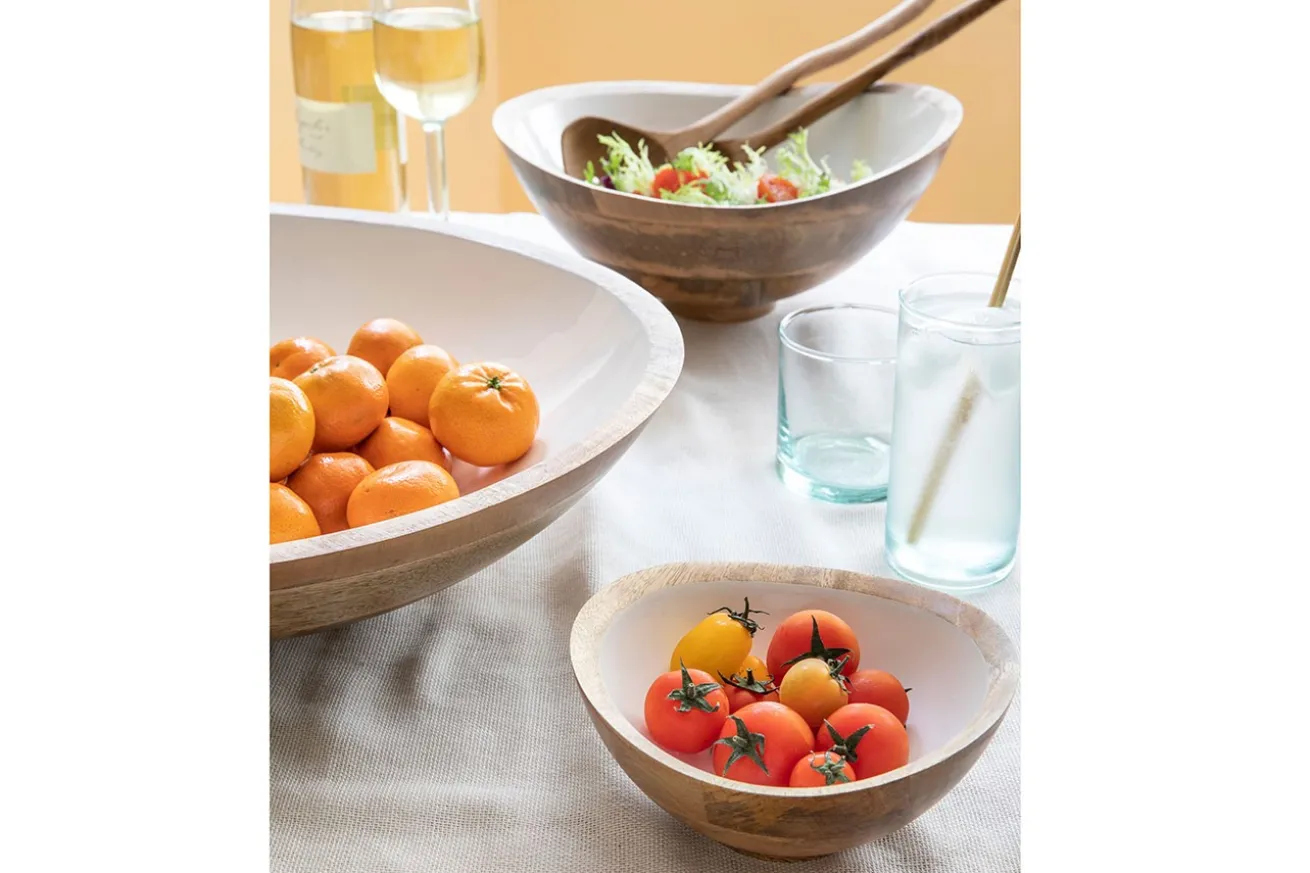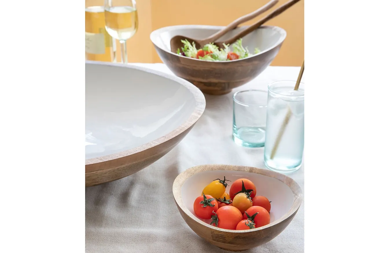 Ob Sie diese dekorative Schale nun zum Stapeln von Obst verwenden oder darin Salat einmachen, ist ganz egal. Denn die Lebensmittelechtheit der Schale garantiert, keine Schadstoffe freizulassen. Die handgefertigte Obstschale aus naturbelassenem, nachhaltig verwendetem Mangoholz bringt auf jeden Tisch frischen Wind. Während außen Holz in seiner Naturfarbe erstrahlt, glänzt die Innenseite mit einer weißen Schicht aus Kunstharz, die die Holzschale aufpeppt. Dadurch kann jedes noch so klein geschnittene Obststück nicht übersehen werden.