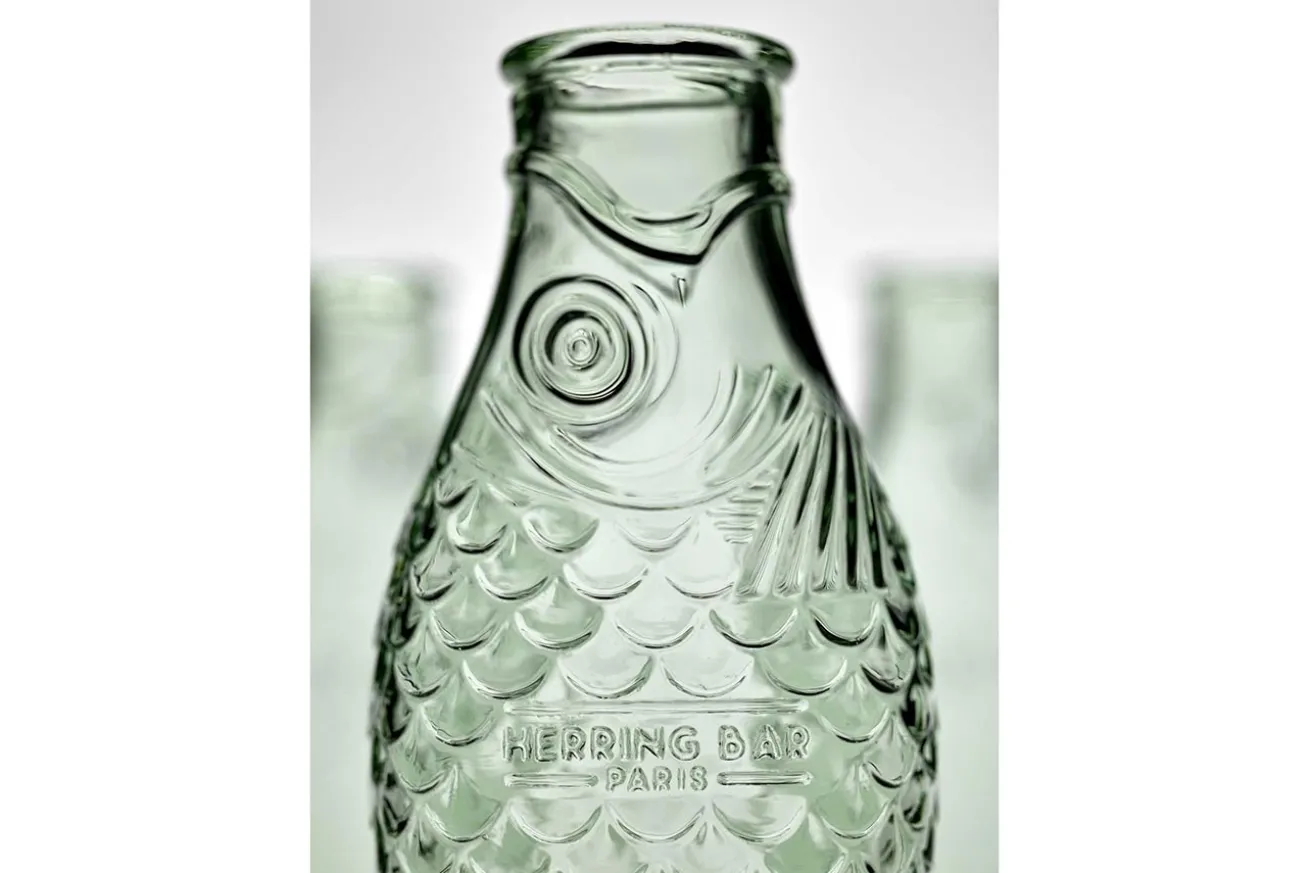 Es muss nicht immer eine schlichte Karaffe für Wasser, Saft oder Wein sein, auch wenn Dekanter äußerst edel aussehen. Mit unserem Modell, welches die Form eines Herings hat, sorgen Sie bei Ihren Gästen für Staunen und Nachfrage, woher Sie das praktische und dekorative Objekt denn her haben. Mit einer Breite von 10,6cm, einer Tiefe von 7,5cm sowie einer Höhe von 29cm lässt sich der grüne Glasfisch mit Schuppen mit so einigen Flüssigkeiten auffüllen.