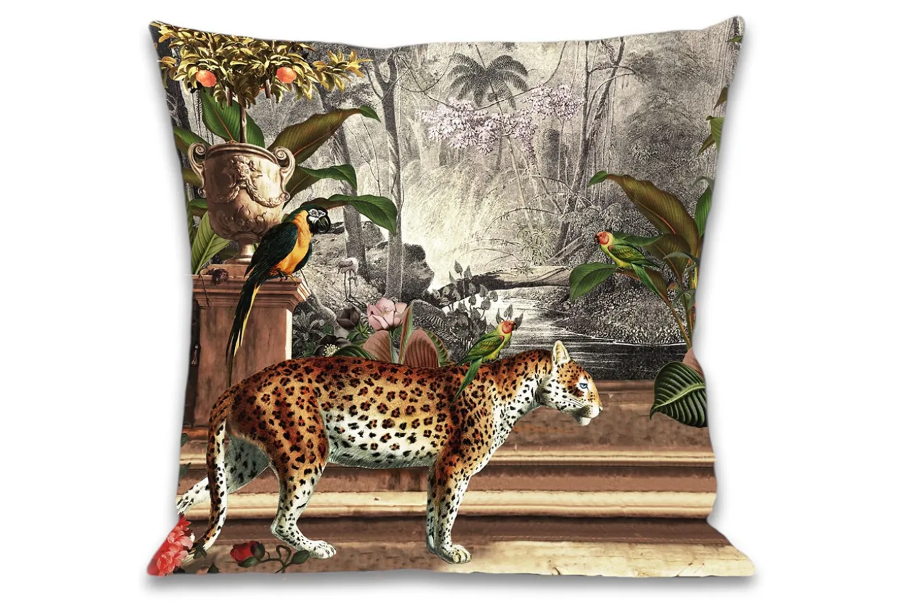 Eine etwas andere Zusammenkunft von Tieren aus dem Paradies. Leopard und Papageien scheinen am Eingang eines Palastes zu stehen und auf irgendjemanden zu warten.