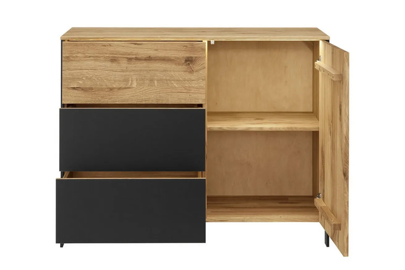 Wer auf den Mix aus Rustikalität und Moderne steht, kommt an Benni nicht vorbei. Die niedrige Wohnzimmerkommode, die hervorragend unter einen Fernseher passt, zeichnet sich durch sein Design aus. Das Möbelstück besteht zum größten Teil aus Holz der Wildeiche. Diese Sorte hat stark ausgeprägte Wuchsmerkmale wie Astlöcher, Harzkanäle und Jahresringe. Die Oberfläche des Holzes wurde jedoch geölt, so dass keine Verletzungsgefahr besteht. Das Flursideboard erstrahlt in der natürlich-warmen Farbe des Eichenholzes. Kombiniert mit den schwarzen Highlights, die aus einer Schublade und Füßen bestehen, wird daraus ein extravagantes Möbelstück, an dem man so schnell nicht seine Freude verliert. Doch die Konsole sieht nicht nur gut aus, sie hat auch ausreichend Stauraum für elektronische Geräte und Dekoobjekte jeglicher Art.