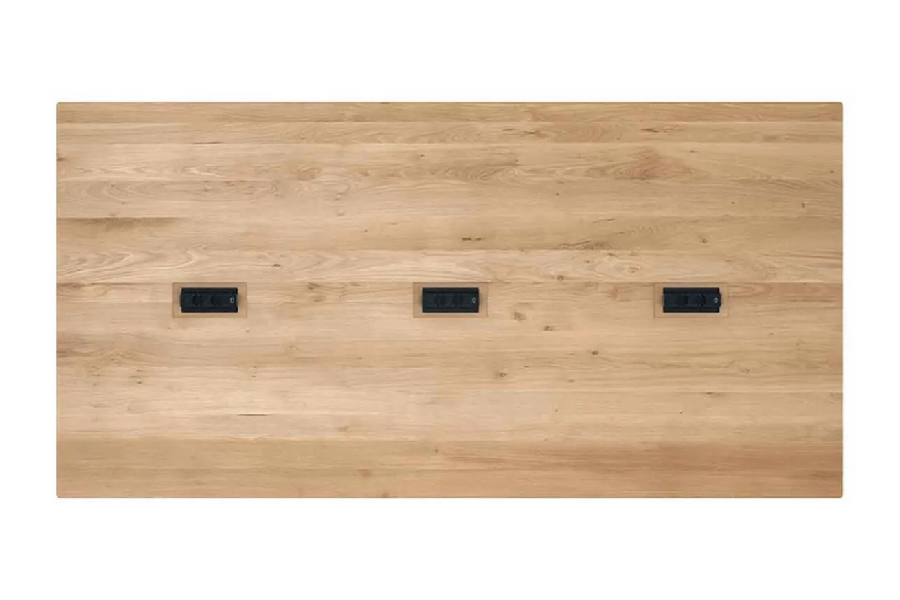 Was bei einem perfekten Bürotisch nicht fehlen darf, sind Steckdosen und USB-Anschlüsse, damit auch das längste Seminar nicht wegen leerer Akkus unterbrochen werden muss. Ein Computertisch aus Eiche, ein modernes Möbelstück für Ihr Büro! mit einer Breite von 240cm, einer Tiefe von 140cm sowie einer Höhe von 76cm und einer Plattenstärke von 2cm bietet er genügend Fläche, um als Arbeitsplatz für Sie und Ihre Kollegen zu dienen. Die Arbeitsfläche ist aus naturfarbenem Eichenholz mit lackierter Oberfläche, die das Holz vor Kratzern und anderen Schäden schützt. An der geraden Kante lassen sich Bürostühle problemlos dranschieben. Die eher schmalen Holzfüße, die ebenfalls naturfarben sind, führen zur verstärkten Beinfreiheit. Auch in den Pausen wird sicher am Bok Cowork Desk gesessen und die Lieblingsserie angeschaut.