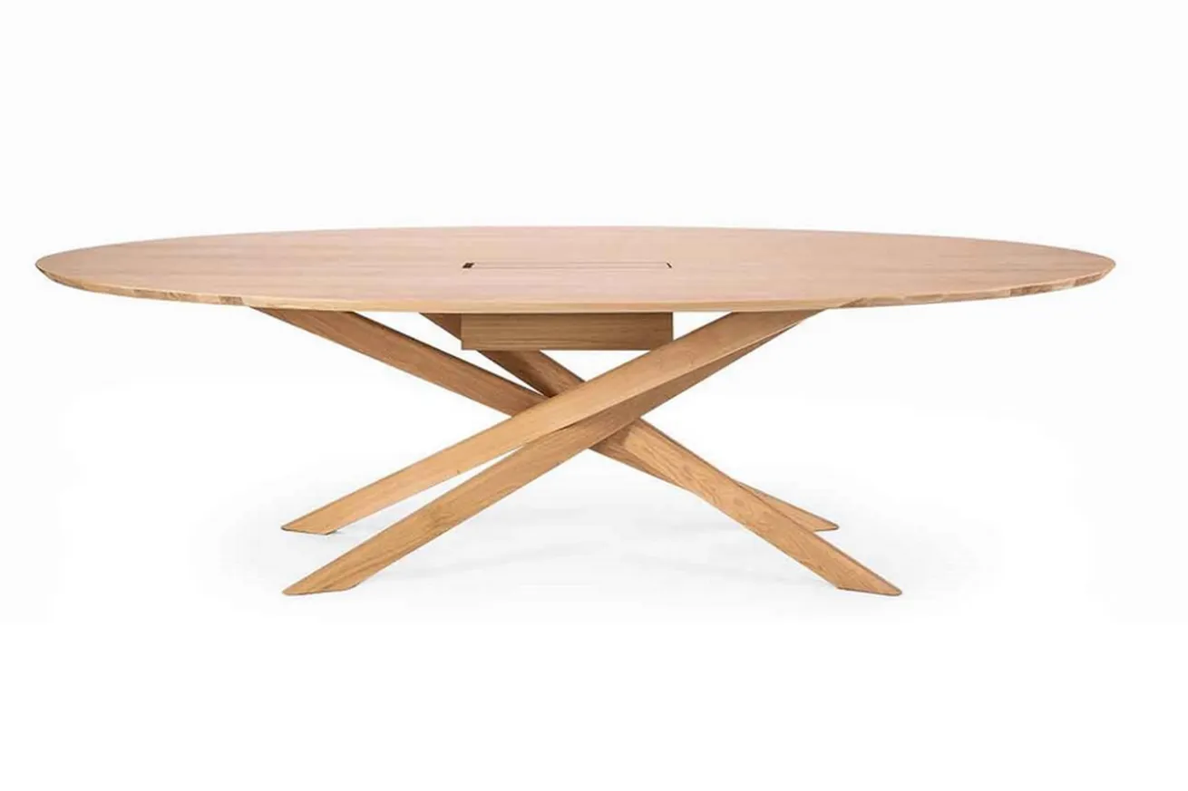 An einem ovalen Konferenztisch können Gespräche besser geführt werden, da sich jeder der Beteiligten direkt anschauen kann und das Gefühl von Gemeinschaft entsteht. Mit einer Breite von 267cm und einer Tiefe von 138cm haben auch genügend Mitarbeiter Platz, um über ihre wichtigen Erkenntnisse und Ergebnisse zu sprechen. An einem massiven Holztisch aus Eiche, einem sehr beliebten Möbelholz, kann auch intensiv gearbeitet werden. Die naturfarbene Oberfläche des Holzes wurde zum Schutz geölt. Massiv sieht er zunächst gar nicht aus, da die schweizer Kante die Stärke der Tischplatte versteckt. Die Rustikalität des Tisches aus Eichenholz wird durch die Füße, die ebenfalls aus Eiche sind und wie Mikadostäbchen angeordnet wurden, rausgenommen und zu einem modernen Möbelstück zusammengefügt.