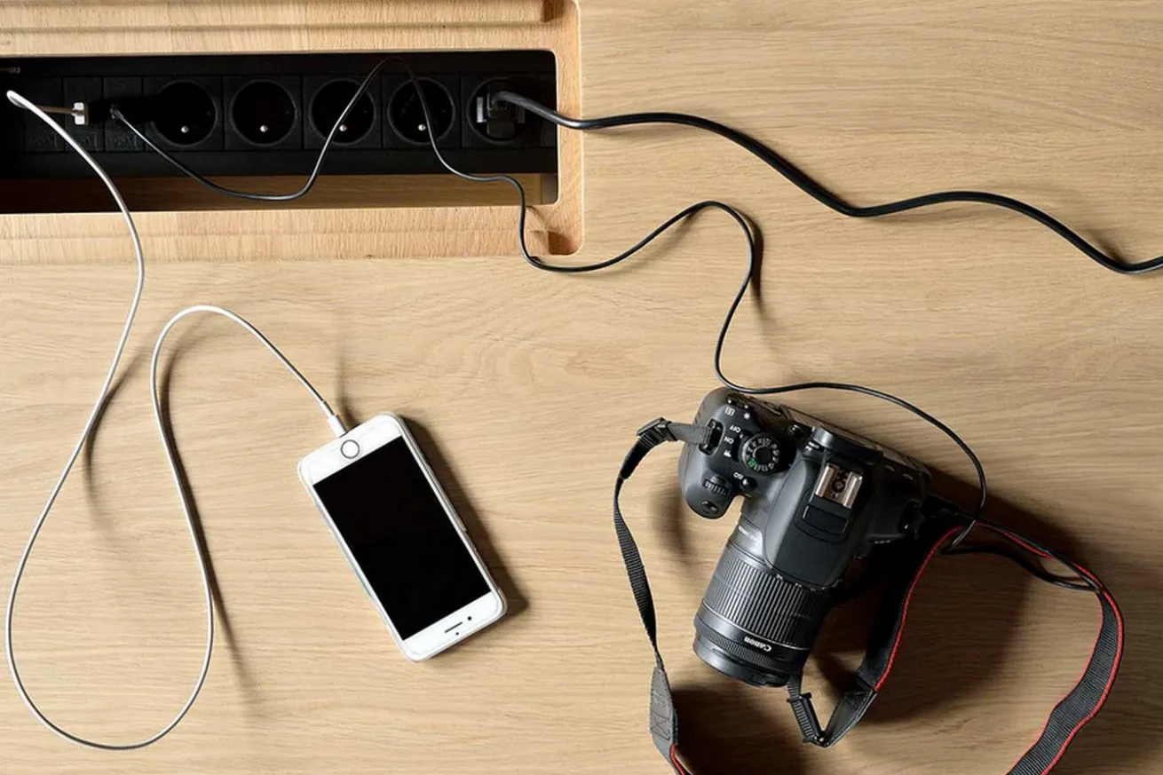 Das bekannte Mikado-Design von Alain van Havre wurde zu einem eleganten Besprechungstisch mit Kabelmanagement. Halten Sie Kabel und Ladegeräte dank der Holzkiste in der Mitte der Tischplatte außer Sicht.