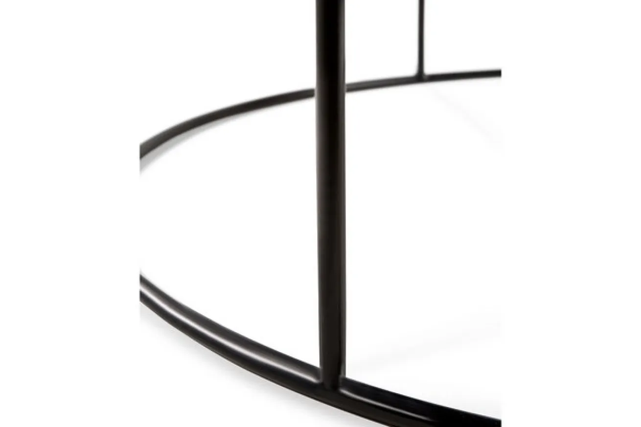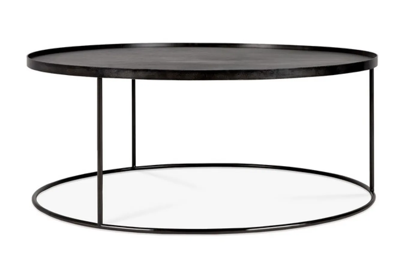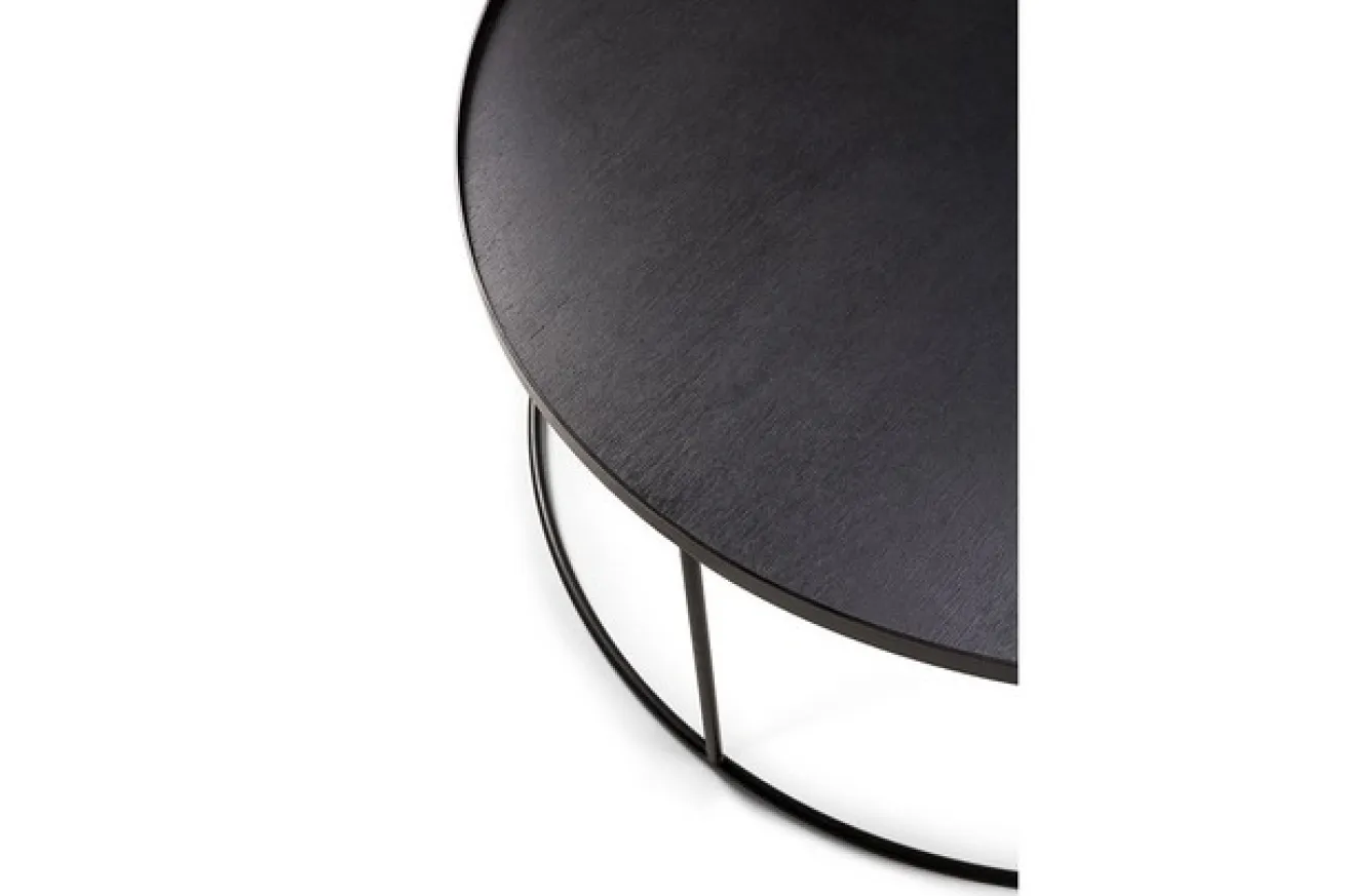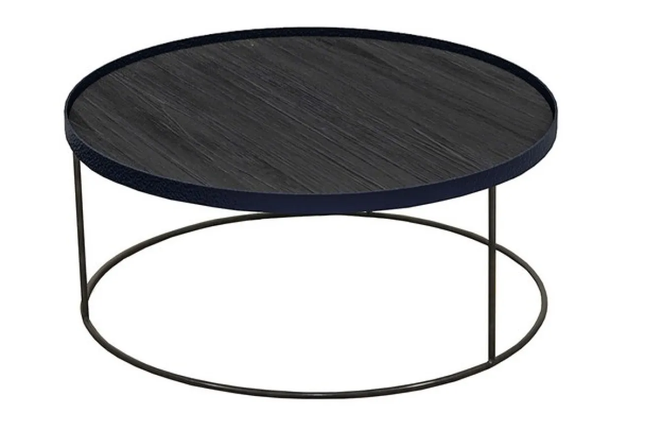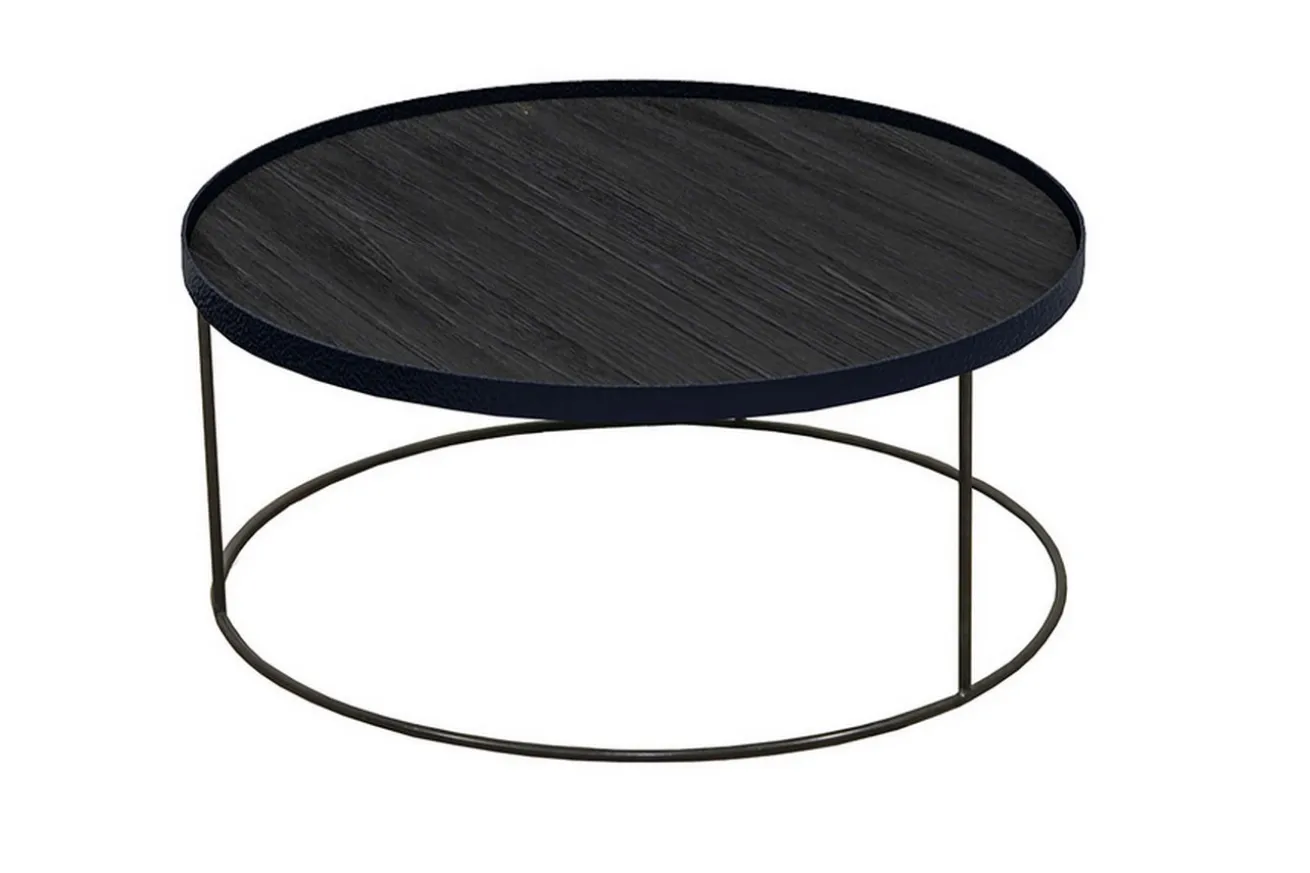 Bei diesem Möbelstück handelt es sich um einen eleganten und vielseitigen Tablettisch der Firma Notre Monde aus Belgien. Der Tisch lässt sich durch verschiedene Tabletts erweitern und mit vielen Farben kombinieren, passt somit perfekt in jeden Wohnbereich. Der Sofatisch hat einen Durchmesser von 93cm und eine Höhe von 38cm. Ein schwarzes Metallgestell mit einer schwarz gebeizten Holzoberfläche bilden zusammen ein modernes Möbelstück für Ihr Wohnzimmer.