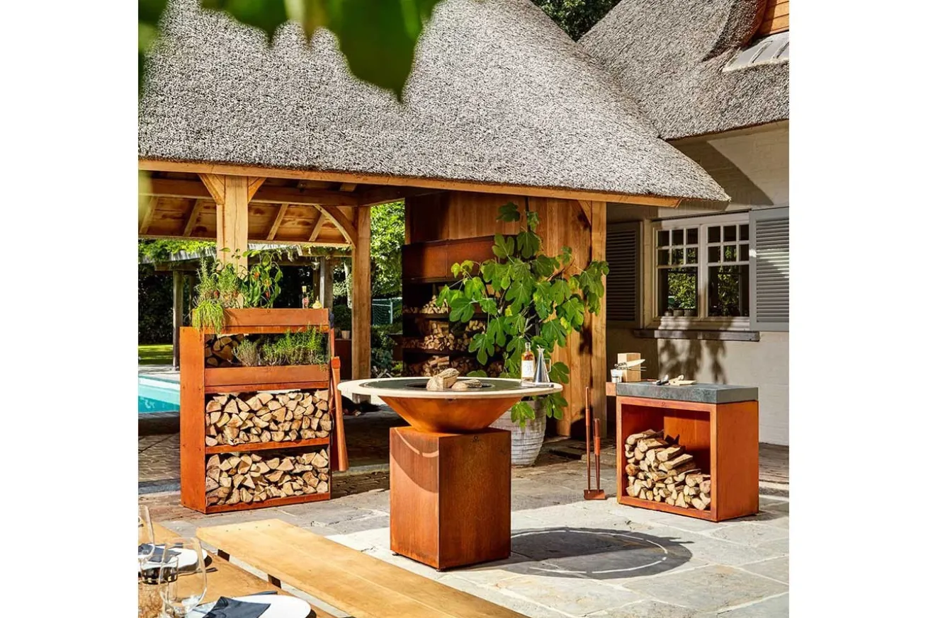 Der Ofyr Butcher Block Storage 90 Corten ist eine ideale Ergänzung der Ofyr Classic Reihe. Er verfügt über ein Schneidebrett aus Keramik, einen Zubehörbehälter und Stauraum für Brennholz. Das Schneidebrett ist in Teakholz oder dunkelgrauer Keramik erhältlich.