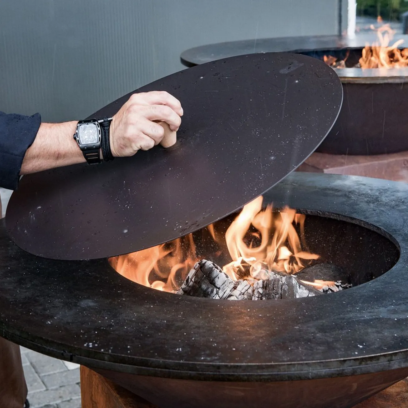 Hergestellt aus schwarzem, pulverbeschichtetem Stahl und ausgestattet mit einem Mahagoniknauf. Bitte verwenden Sie Ihren Snuffer Black 85 (Ø 50 cm), Snuffer Black 100 (Ø 60 cm) und Snuffer Black XL (Ø 90 cm), um Ihre OFYR-Einheit nach der Verwendung sicher zu löschen. Die Snuffer sind mit 6 Ausbuchtungen versehen, damit sie beim Löschen der Flamme nicht verrutschen.