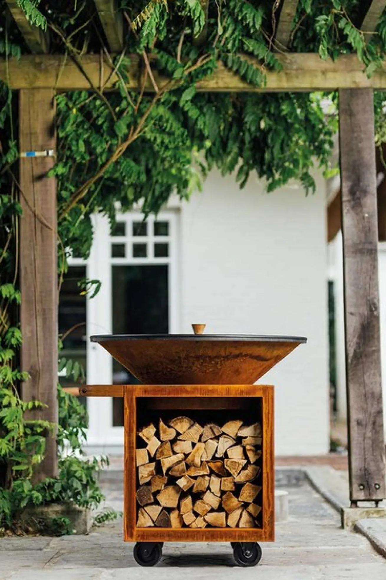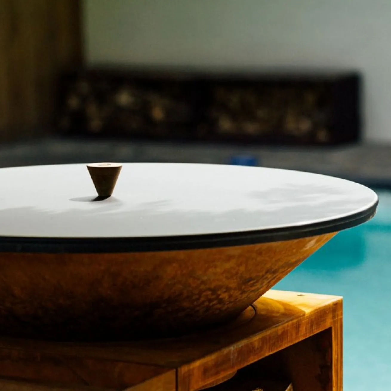 Hergestellt aus schwarzem, pulverbeschichtetem Stahl und ausgestattet mit einem Mahagoniknauf. OFYR Cover 85 (Ø 85 cm) und Cover 100 (Ø 100 cm) passen auf den Kegel und die Platte und bedecken Ihren OFYR, wenn er nicht benutzt wird.