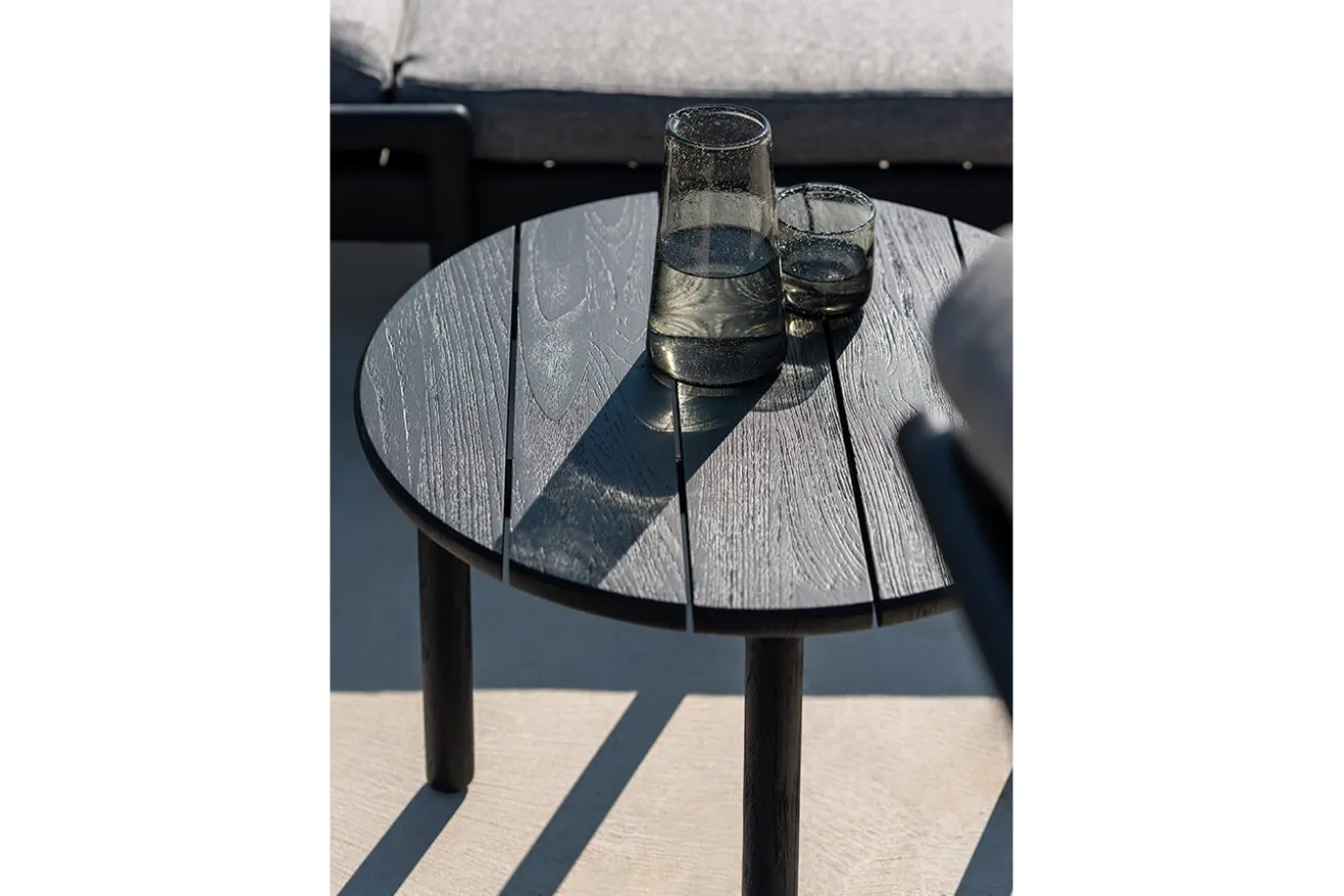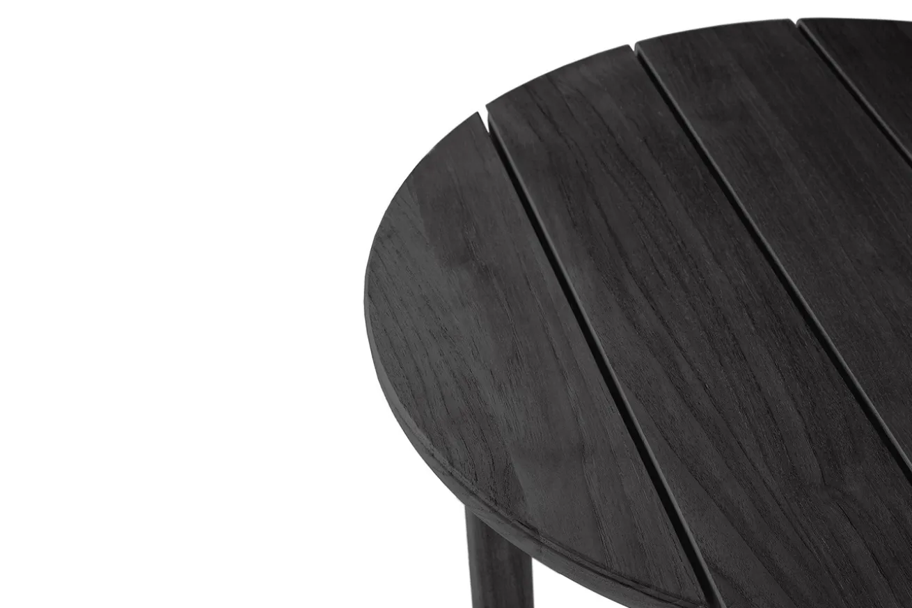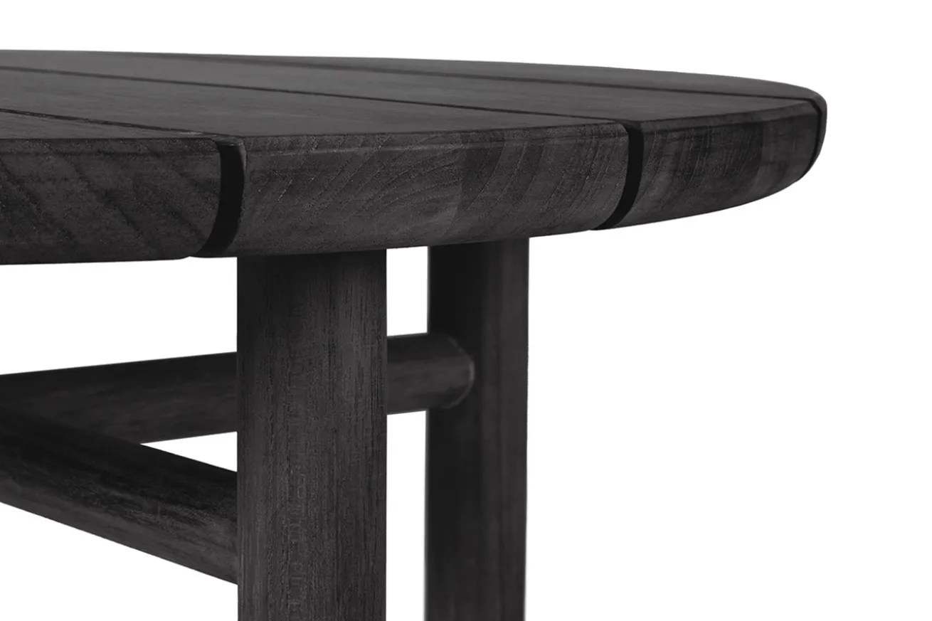 Tauchen Sie ein in die Welt der Eleganz mit unserem runden Outdoor Beistelltisch aus edlem Teakholz, präsentiert in einer zeitlosen schwarzen Farbgebung. Dieses exklusive Möbelstück vereint stilvolles Design mit hoher Funktionalität und verleiht Ihrem Außenbereich einen Hauch von Luxus.