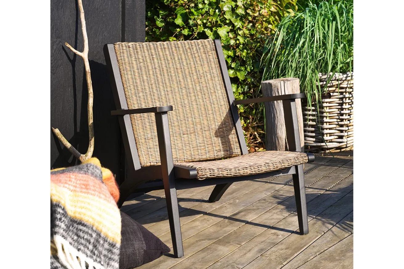 Bei diesem Loungesessel für Garten und Balkon müssen Sie sich nicht sorgen, dass das Rattan irgendwann schlecht wird, denn das Material, das in Lehne und Sitz verwendet wurde, ist Polyrattan, einem Rattan ähnlichen Material, das sich durch seine Flexibilität auszeichnet, was bei richtigem Rattan nicht der Fall ist. Der naturfarbene Stoff ist witterungsbeständig und pflegeleicht und hat feuchtigkeitsabweisende Eigenschaften, perfekt also für lange Sommerabende draußen mit Freunden. Das Gestell, das das Polyrattan umrahmt, ist aus schwarz pulverbeschichtetem Aluminium. Zusammen ergibt das einen Loungesessel, der nicht nur in moderne Gärten passt, sondern auch eine grandiose Figur auf Terrassen im Skandistil und auf Balkonen im Ibiza-Style macht.