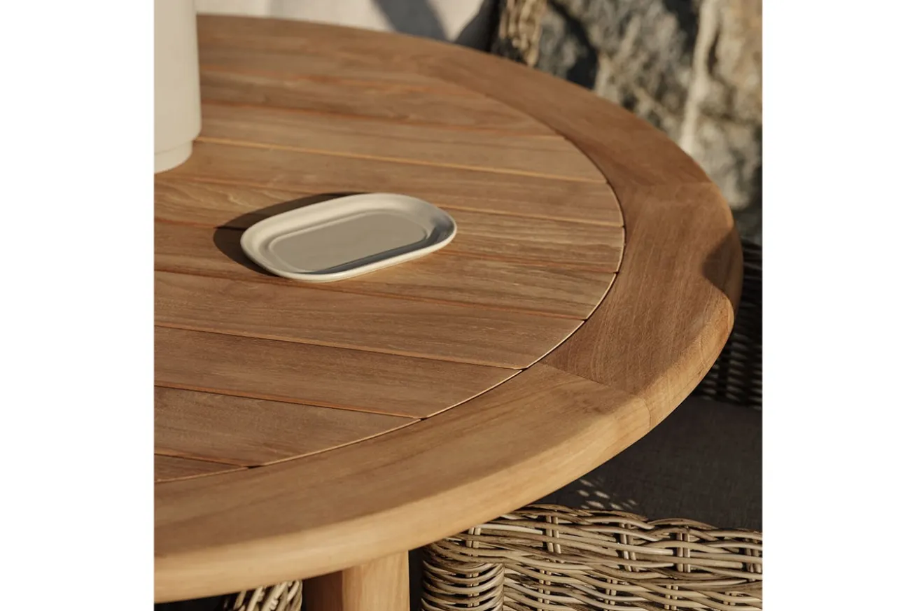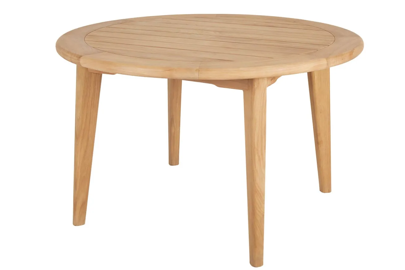 Dieser runde Terrassentisch mit einem Durchmesser von 120cm besteht komplett aus Teakholz in Naturfarbe. Die Oberfläche wurde geglättet, jedoch wurde nichts verändert, so dass die dunkle Maserung, die typisch für Teakholz ist, erhalten bleibt, und so der Charakter des Holzes besteht. Warum quadratisch oder rechteckig, wenn es auch mal rund zugehen kann? Lilja eignet sich sicherlich auch für Balkone, die nicht viel Platz fassen. Kombinieren Sie Stühle aus dem gleichen Holz und leben Sie den minimalistisch und doch gemütlichen Skandistil in vollsten Zügen aus.