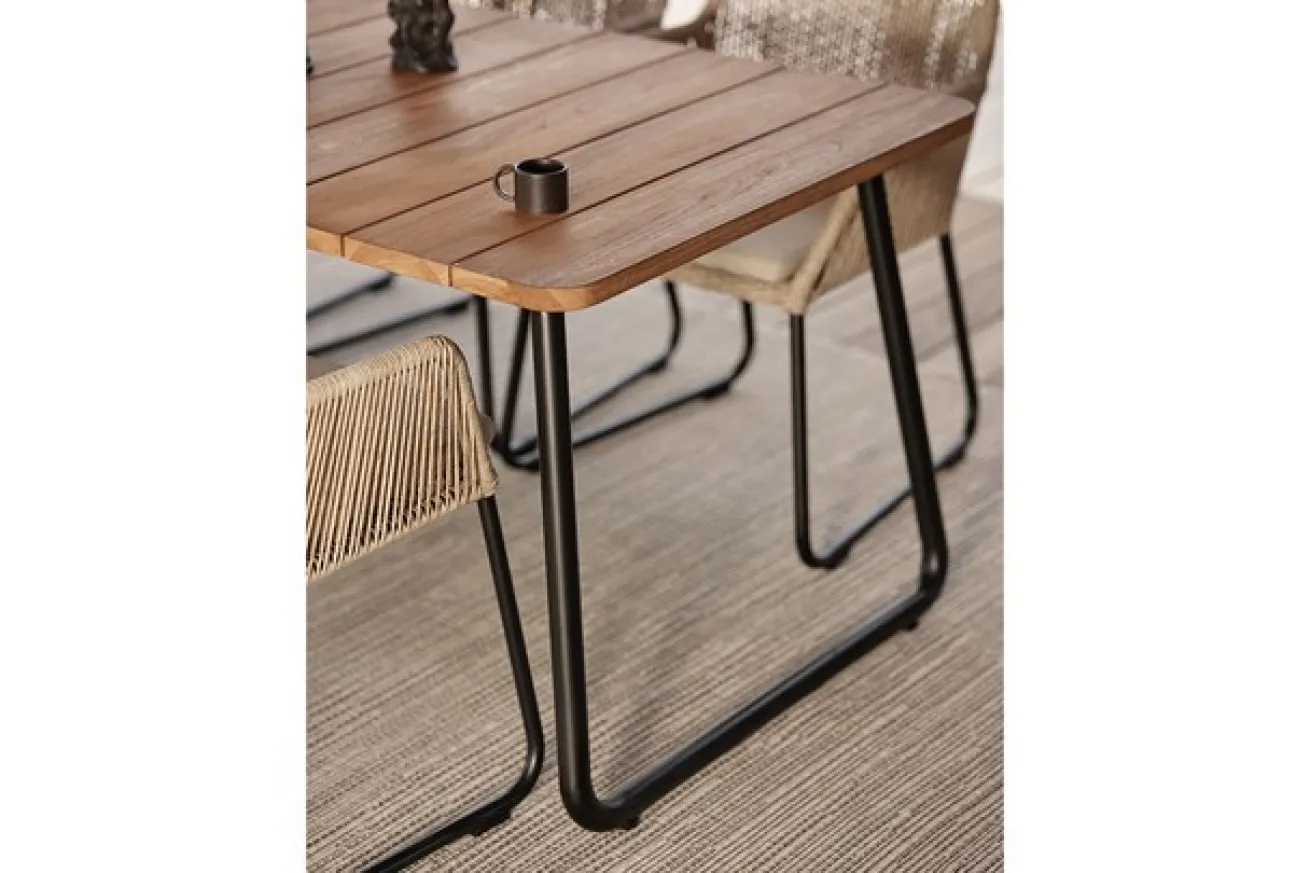 Die schwarzen Metallfüße verleihen dem rechteckigen Gartentisch ein modernes und zeitloses Aussehen, das jeden Außenbereich aufwertet. Die stabile Konstruktion sorgt für eine zuverlässige Stabilität und Langlebigkeit, während das schwarze Finish einen eleganten Kontrast zur natürlichen Schönheit des Teakholzes bildet.