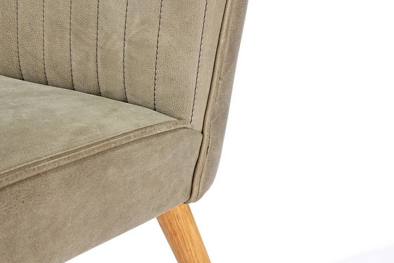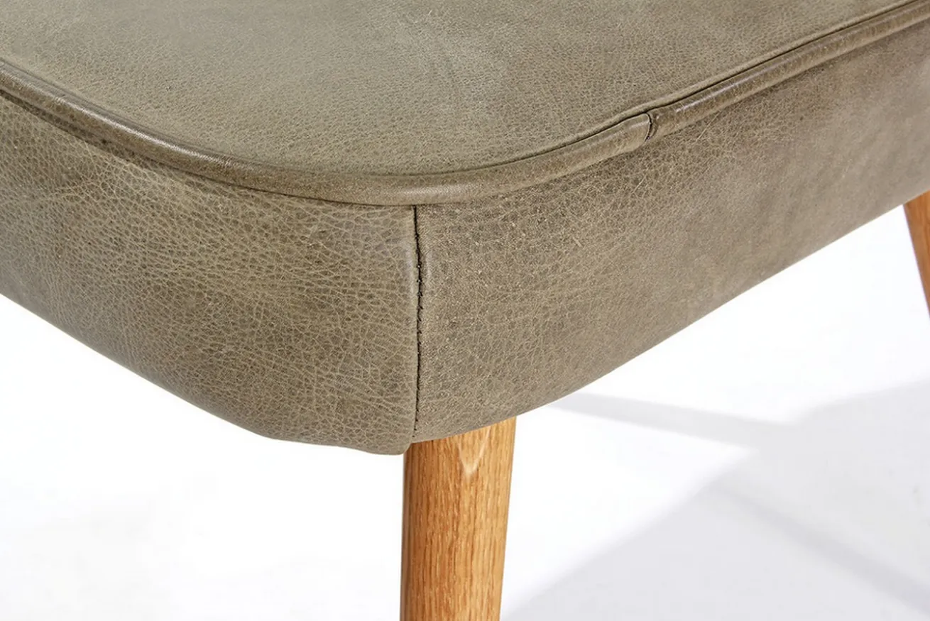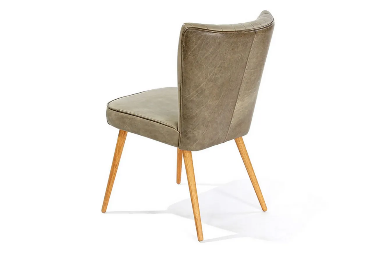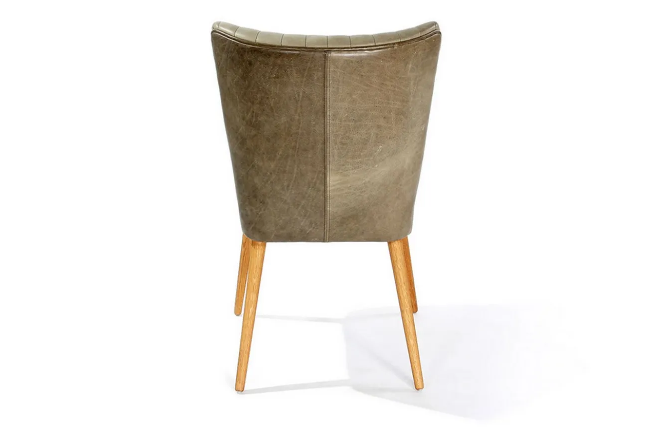 Dieser Esszimmerstuhl ähnelt seinem gleichnamigen Verwandten. Der Unterschied liegt hier aber bei der Materialwahl. Dieses khakifarbene Modell besteht nämlich aus einem ledernen Bezug mit schöner Polsterung, die Jules zu einem gemütlichen Küchenstuhl macht. Ein Highlight sind die Längsstreifen in der Lehne, die alle Blicke auf sich ziehen. Getragen wird der grüne Korpus von vier Füßen aus massivem, naturfarbenen Eicheholz, wodurch eine harmonische Symbiose entsteht, die in jedes Esszimmer im Skandi- oder Nature-Stil passt. Ob lange Arbeitsnächte im Esszimmer oder aber spannende Unterhaltungen mit Freunden bei einem Glas Wein, auf Jules können Sie jede abendliche Beschäftigung stundenlang aushalten.