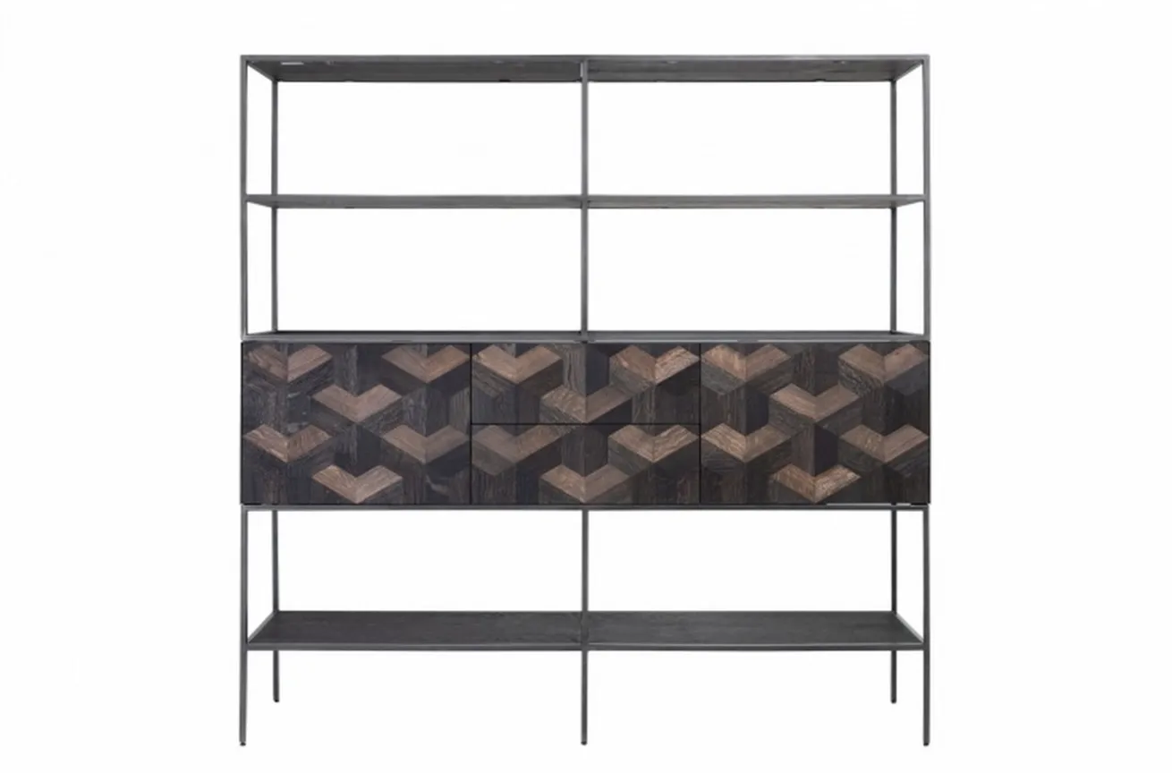 Mit diesem Wandregal träumen wir uns ganz einfach in die Wildnis: zum modernen Ethno-Look haben wir unser 166cm breites und ebenso hohes Standregal. Das dunkle Stahlgestell ist filigran und steht im Konrast zu Türen und Schubladen, von denen es jeweils 2 gibt. Diese verleihen dem Möbelstück mit den Regalen eine Tiefe von 45cm. Das auch als Raumteiler dienen könnende Möbelstück hat Einlegeböden aus MDF Platten im furnierten Eiche Look. Ein optisches Highlight setzt das Muster auf den Türen, die v-förmig angebracht sind und mal heller, mal dunkler erscheinen. Stellen lässt sich Illusion nicht nur ins Wohnzimmer, sondern mit seinen zahlreichen Regalböden auch ins hauseigene Büro an die Wand. Mit genügend Stauraum und Stellfläche wird in jeder Räumlichkeit für Ordnung gesorgt.