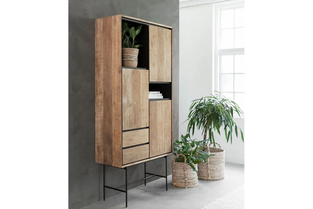 Egal in welchem Raum, Stauraum ist immer von Nöten, sei es Flur, Büro oder Wohnzimmer. Wie gut, dass Metropole Abhilfe schafft! Das Wandregal auf schwarzen Metallfüßen zeichnet sich durch das naturfarbene Teakholz, aus dem es besteht, aus. Es sieht nicht nur mordern aus, sondern wurde auch kunstvoll gestaltet, denn Symmetrie hat hier keinen Platz: Türen und Schubladen sind eingebaut, aber so, dass eine freie Ablagefläche ensteht. So lassen sich problemlos Dekoobjekte wie Vasen oder eingerahmte Bilder, aber auch Ihre Lieblingsbücher kunstvoll platzieren.