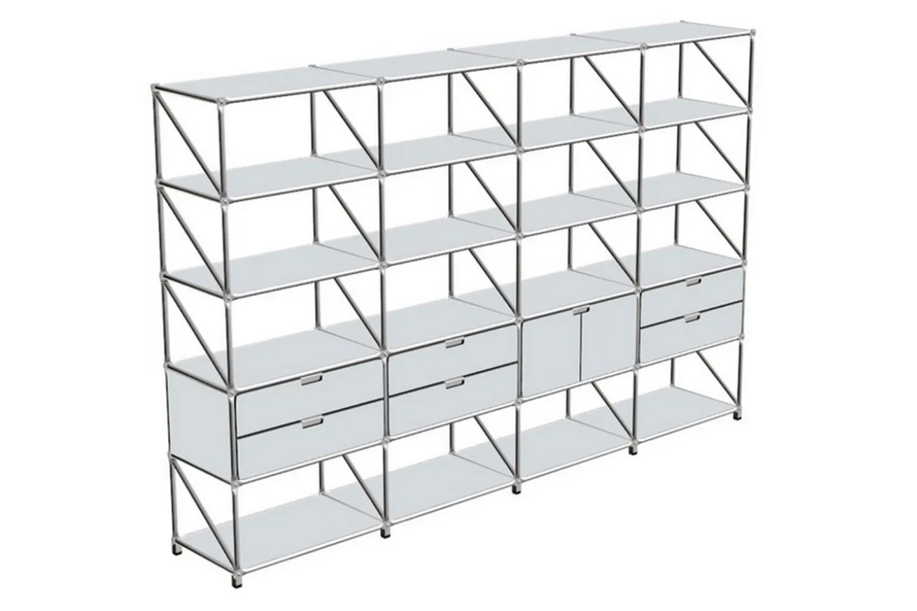 Diese Regalwand hat eine Breite von 291cm, eine Höhe von 187,5cm und eine Tiefe von 37cm. Sie besteht aus Edelstahl und grauen MDF Platten. Dieses Regalsystem passt dank seines Looks nicht nur in moderne Wohnräume, sondern auch in Büros, beispielsweise an der Wand oder als Raumteiler. Das Wandregal ist groß genug, um nicht nur Ihre Lieblingsbücher darin zu verstauen und fein säuberlich zu präsentieren, sondern auch, um wichtige Dokumente zu verstecken oder um dekorative Objekte aufzustellen.