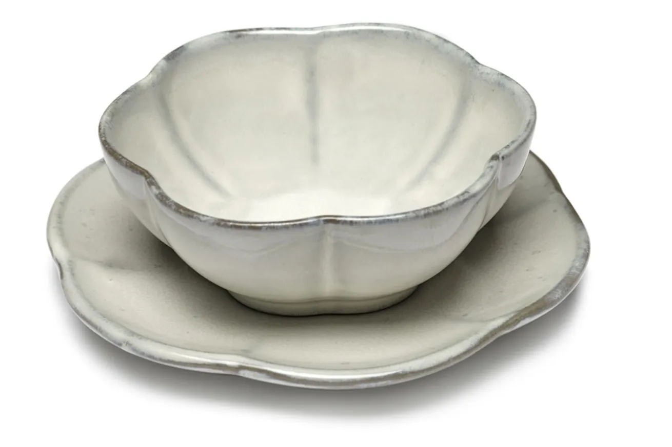 Diese blumenförmige Schale mit einem Durchmesser von 11cm sowie einer Höhe von 4cm eignet sich für Dips, aber auch für die morgendliche Portion Porridge. Die aus weißem Steingut und gräulichem Rand gefertigte Schüssel ist jedoch so außergewöhnlich, dass Sie sie auch nur zu besonderen Anlässen rausholen dürfen. Alles kann, nichts muss. Komplettiert mit anderen Geschirrteilen der Inku-Kollektion in Blumenform kreieren Sie so auf jedem Tisch ein natürlich schönes Ambiente.