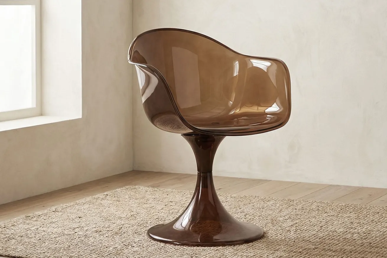 Erhältlich in Gold transparent, Braun und Grau, lässt sich der Stuhl gezielt ins Farbkonzept integrieren oder bewusst als Kontrast einsetzen.