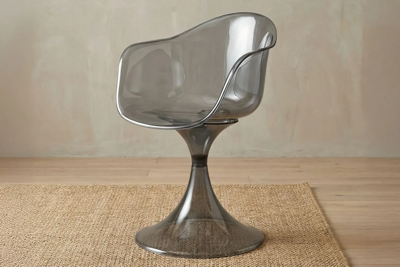 Erhältlich in Gold transparent, Braun und Grau, lässt sich der Stuhl gezielt ins Farbkonzept integrieren oder bewusst als Kontrast einsetzen.