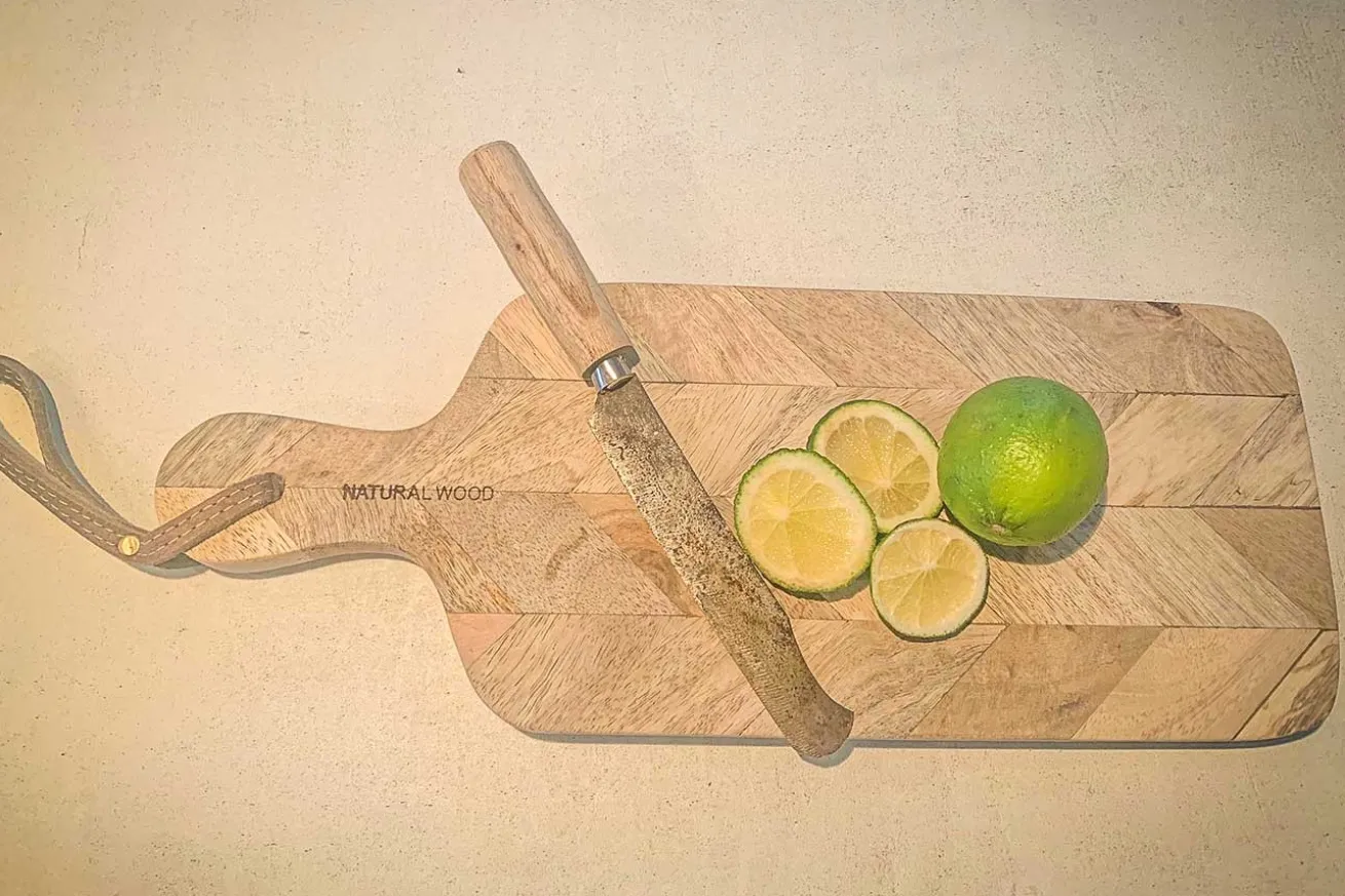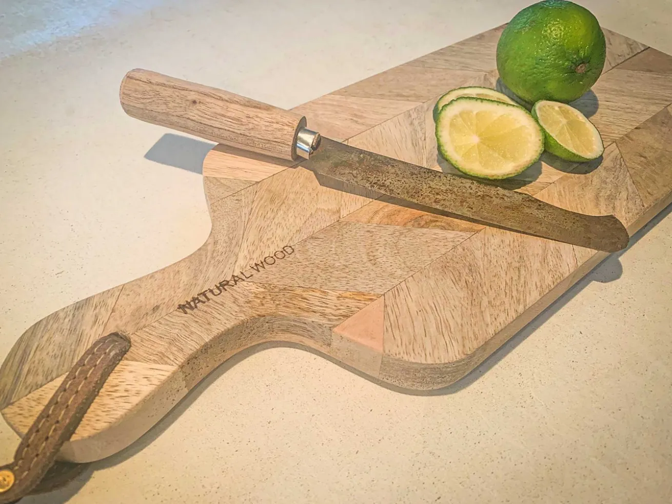 Das praktische Schneidebrett mit einer Breite von 38cm und einer Tiefe von 15cm unterscheidet sich durch sein Herringbone-Muster von anderen herkömmlichen Brettern. Das Produkt hat ein integriertes Lederbändchen, mit dem es sich problemlos an der Wand oder an einer Leiste in der Küche aufhängen lässt. Das naturfarbene Holzbrett kann genauso gut als Frühstücksbrettchen verwendet werden. Oder Servieren Sie auf diesem Küchenbrett eine leckere Käseplatte.