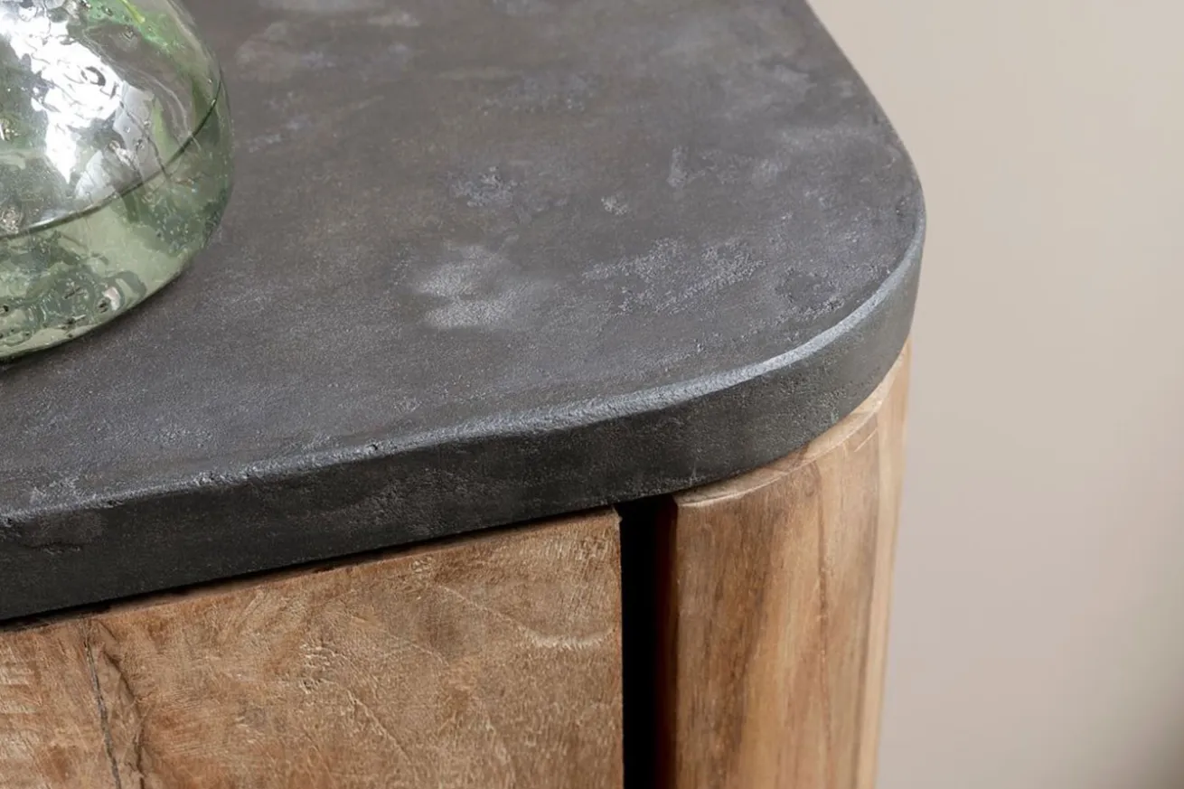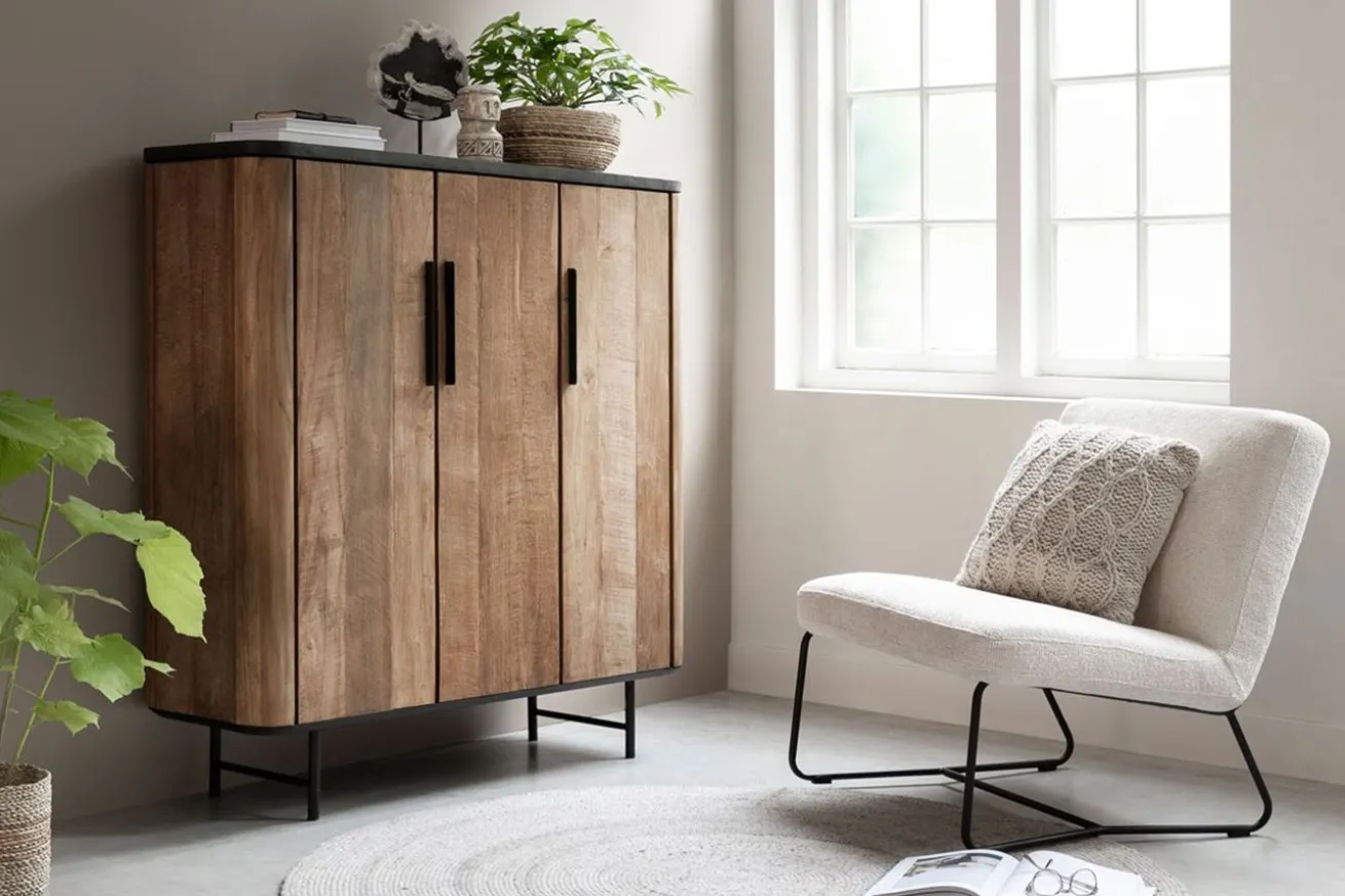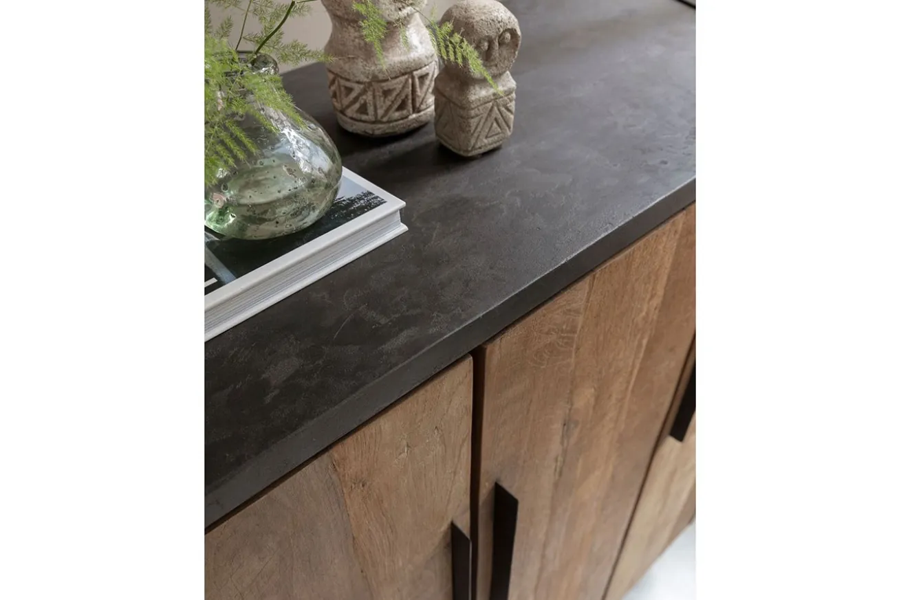 Bringen Sie mit unserem Schrank im Industrial-Stil aus recyceltem Teakholz und schwarzen Mortex-Details zeitlose Eleganz und modernes Design in Ihr Zuhause und schaffen Sie einen Raum, der zum Verweilen und Entdecken einlädt. Hergestellt aus recyceltem Teakholz in Naturfarbe, strahlt der Korpus des Schranks rustikalen Charme und natürliche Schönheit aus. Jedes Stück Holz erzählt seine eigene Geschichte und verleiht dem Schrank eine einzigartige Ausstrahlung.