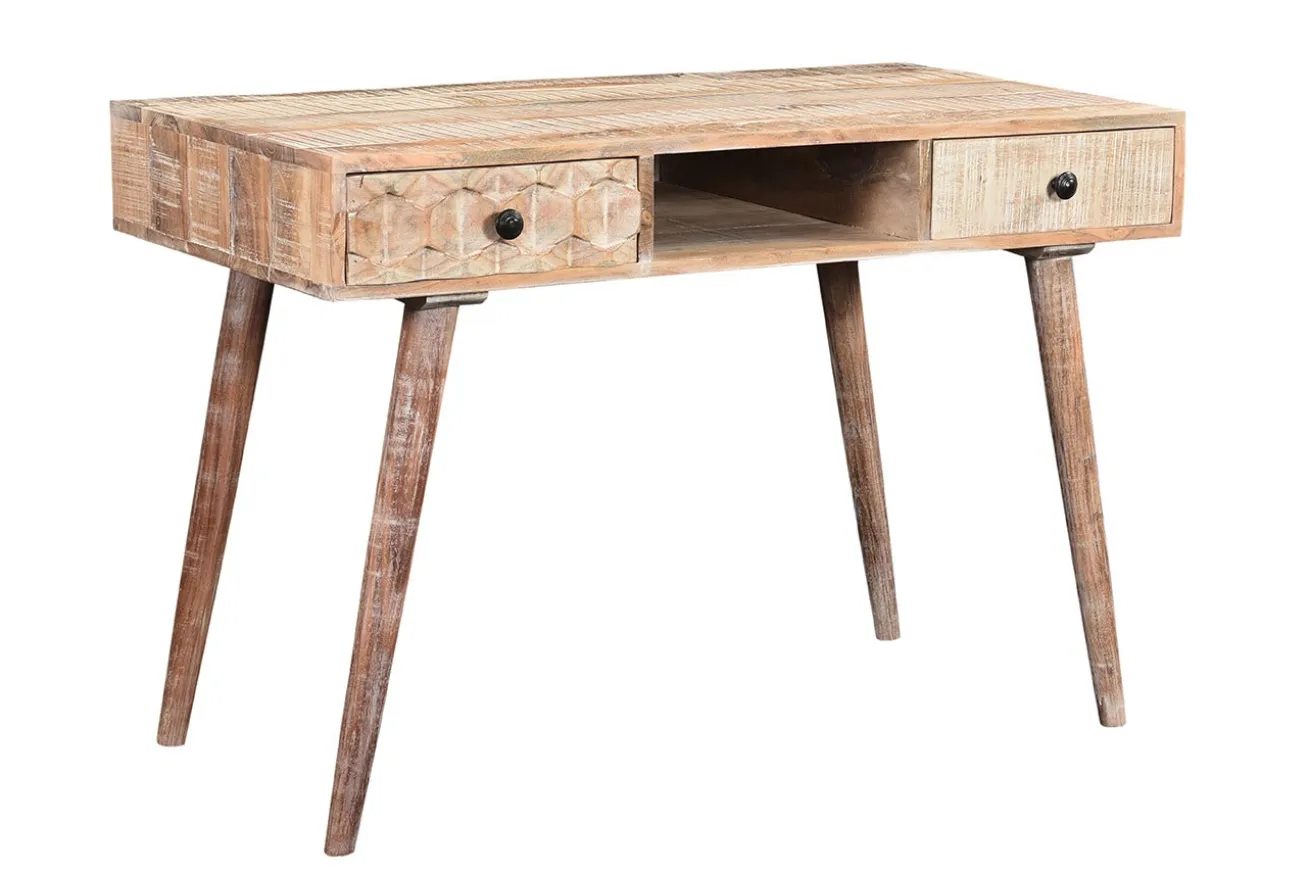 Der im Nature Style gefertigte Bürotisch für Ihr Arbeitszimmer Zuhause ist aus vollholziger Akazie. Das bedeutet, dass es sich nicht um einzelne Planken des warmen Holzes handelt, sondern dass die Teile aus einem Stück gefertigt wurden. Ob für Hausaufgaben oder als Computertisch für Laptoparbeit, das Produkt ist vielseitig einsetzbar und groß genug für alle möglichen Arbeiten. Es hat nämlich eine Breite von ca. 115cm, eine Höhe von ca. 76cm und eine Tiefe von ca. 56cm. Die Besonderheit Ihres zukünftigen Arbeitsplatzes ist nicht nur die Naturfarbe, sondern die weiße Pigmentierung, die überall auf dem Büromöbel zu finden ist. Handgefertigte weiße Highlights, die das Möbelstück zu etwas Ausgefallenem machen. Die Arbeitsfläche wird von vier runden, schmal zulaufenden Füßen getragen und hat nicht nur zwei Schubladen, sondern auch eine zusätzliche Ablage, die sich zwischen den beiden befindet.