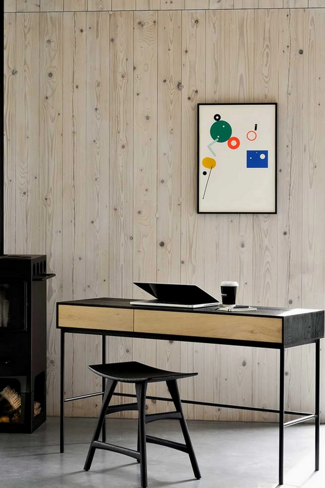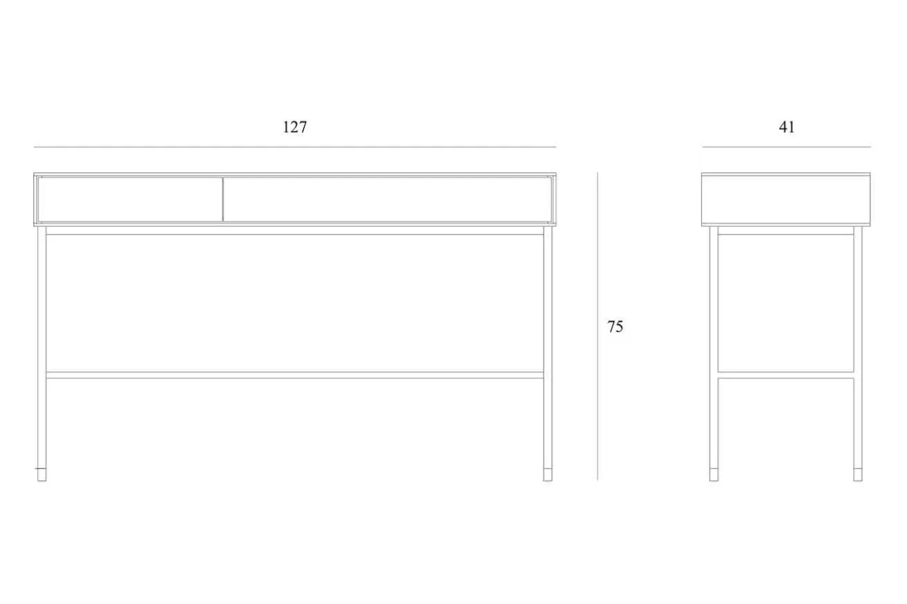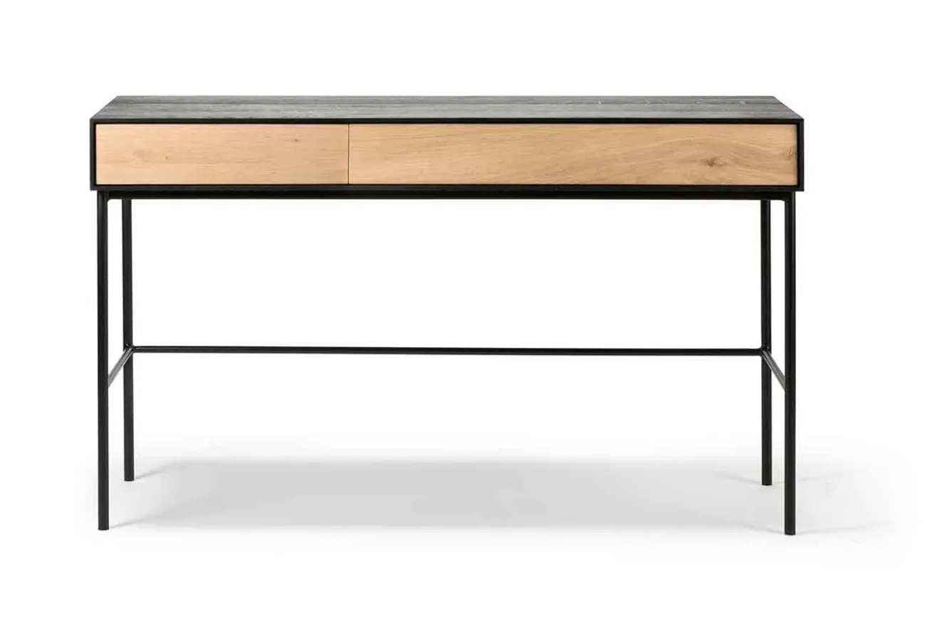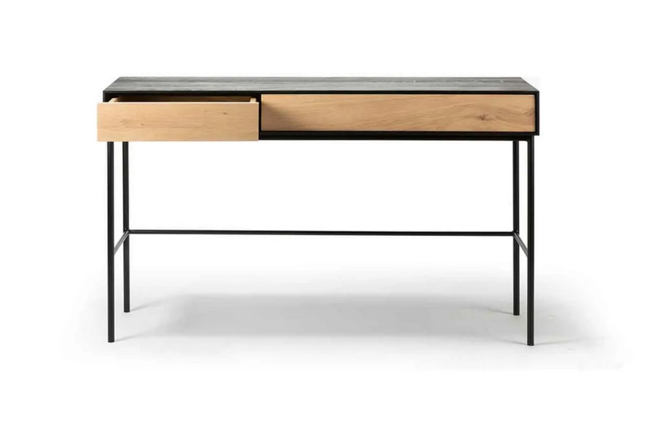 Klein, praktisch, gut. Dieser Schreibtisch findet auch in der kleinsten Ecke seinen Platz. Denn mit einer Breite von 127cm, einer Höhe von 77cm und einer Tiefe von 41cm fällt er relativ schmal aus. Der aus massivem Eichenholz bestehende Korpus wird von einem schwarzen, schmalen Stahlgestell getragen. In der breiten Schublade ist genügend Stauraum für Ihre Unterlagen und Schreibuntensilien.