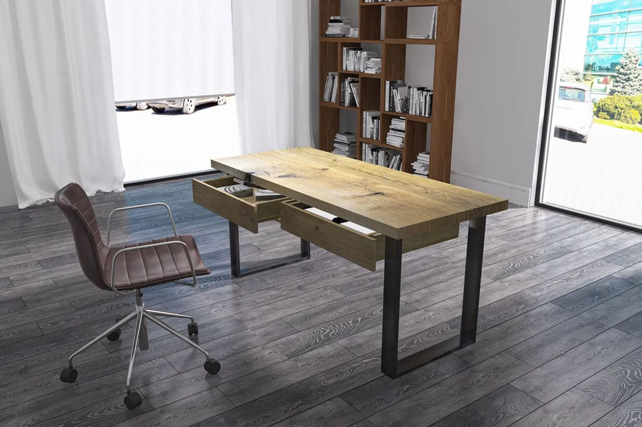Dieser Schreibtisch vereint schlichte Eleganz mit robuster Funktionalität und ist damit die ideale Wahl für jedes moderne Arbeitsumfeld. Die massive Holzplatte präsentiert eine natürliche, warme Ausstrahlung, die durch die charakteristischen Maserungen des Holzes betont wird. Unterstrichen wird das Design von einem stabilen Metallgestell in mattem Schwarz, das dem Tisch eine zeitlose und dennoch moderne Anmutung verleiht. Ein integriertes Schubfach sorgt für praktischen Stauraum und hält Ihre Arbeitsutensilien stets griffbereit. Dieser Schreibtisch ist mehr als nur ein Arbeitsplatz – er ist ein Statement für stilbewusste Effizienz.