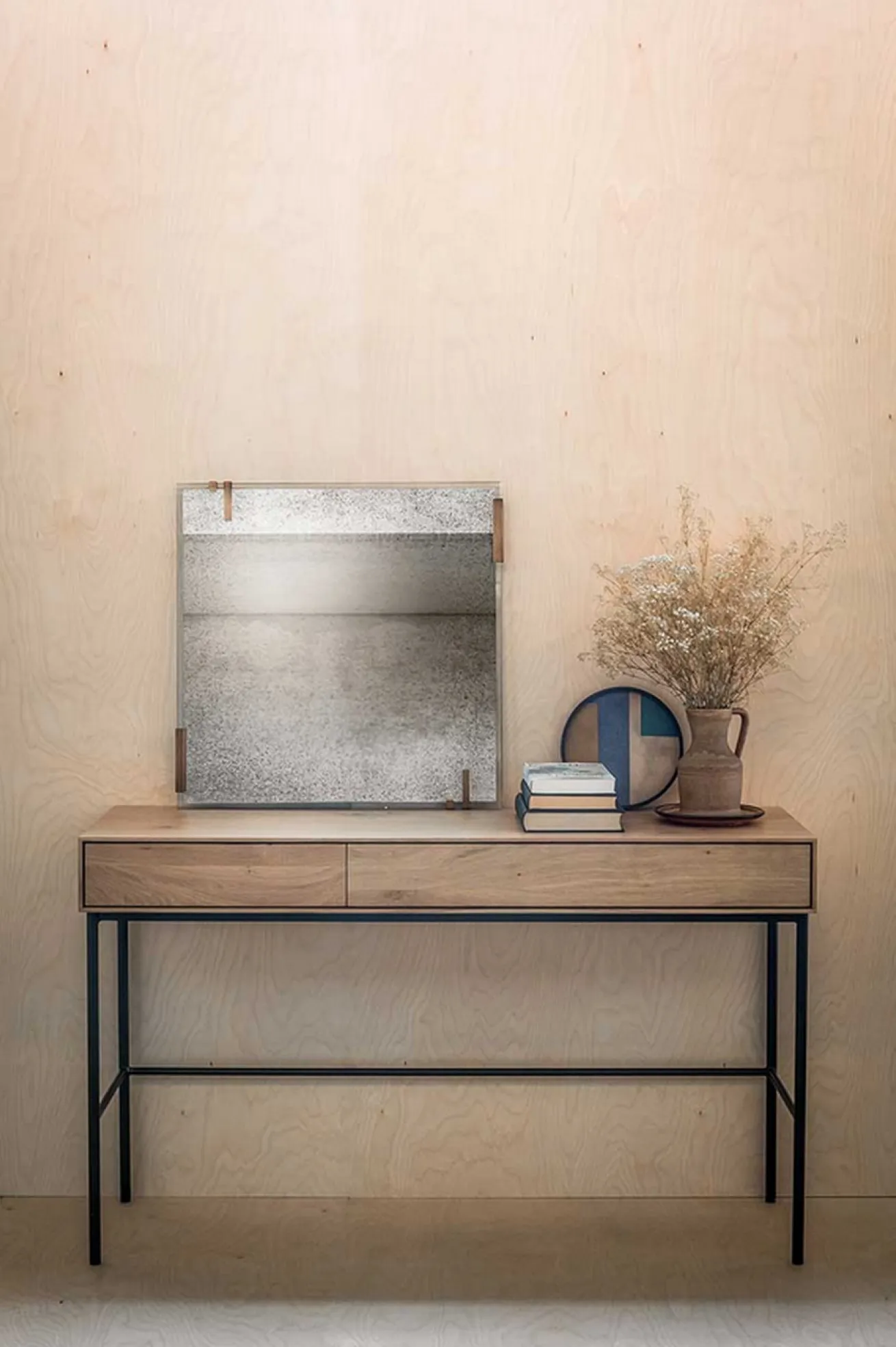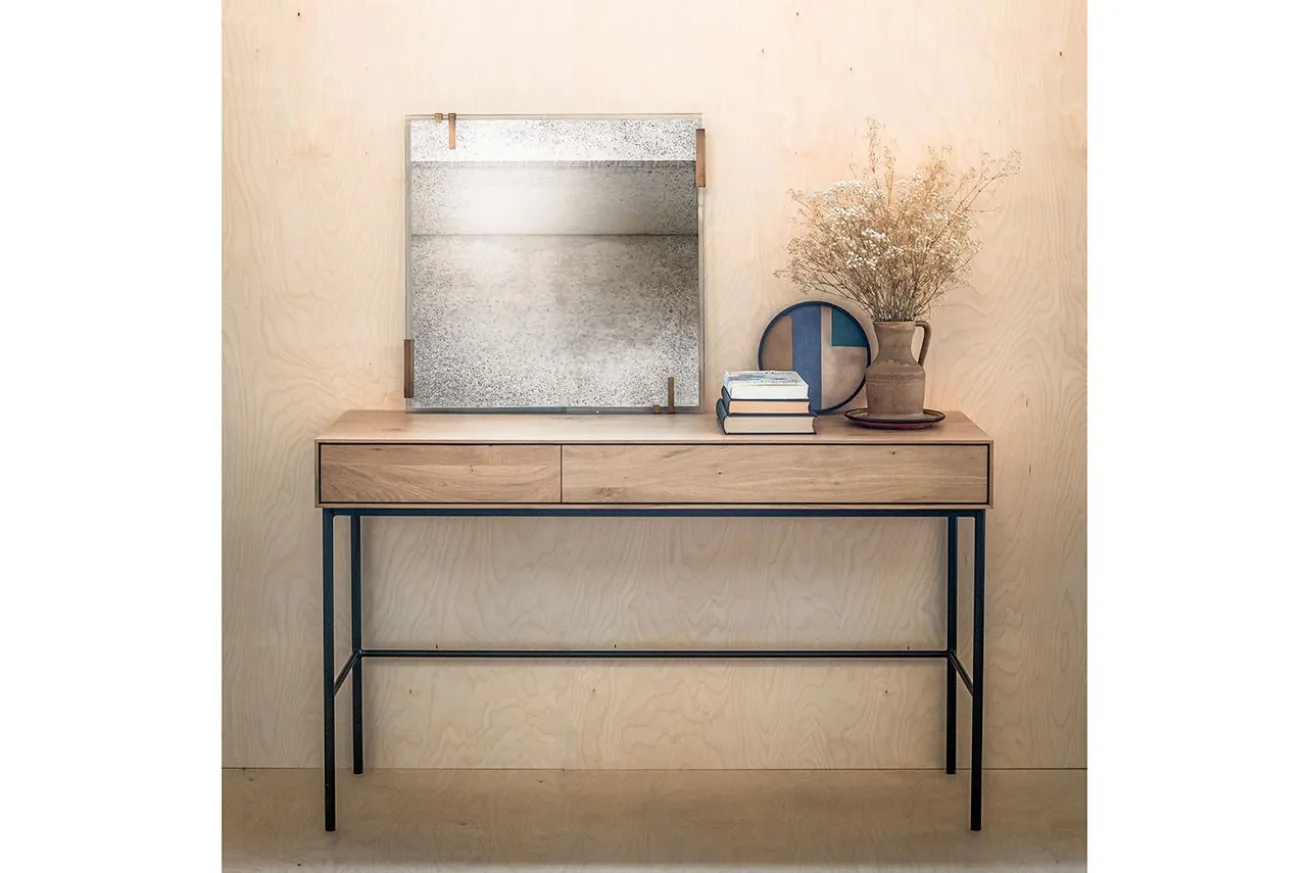 Klein, praktisch, gut. Dieser Schreibtisch findet auch in der kleinsten Ecke seinen Platz. Denn mit einer Breite von 127cm, einer Höhe von 77cm und einer Tiefe von 41cm fällt er relativ schmal aus. Der aus massivem Eichenholz bestehende Korpus wird von einem schwarzen, feinen Stahlgestell getragen. In der breiten Schublade ist genügend Stauraum für Ihre Unterlagen und Schreibuntensilien.