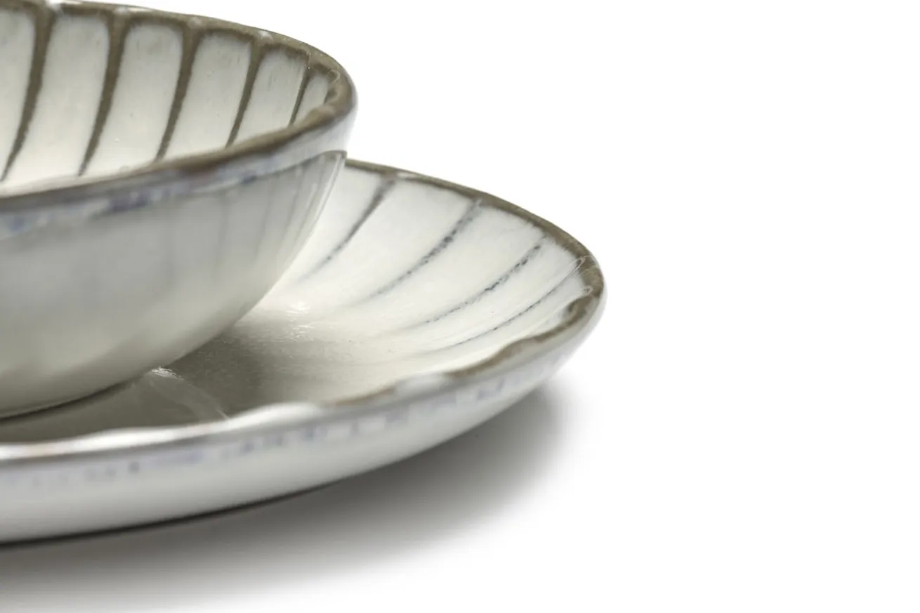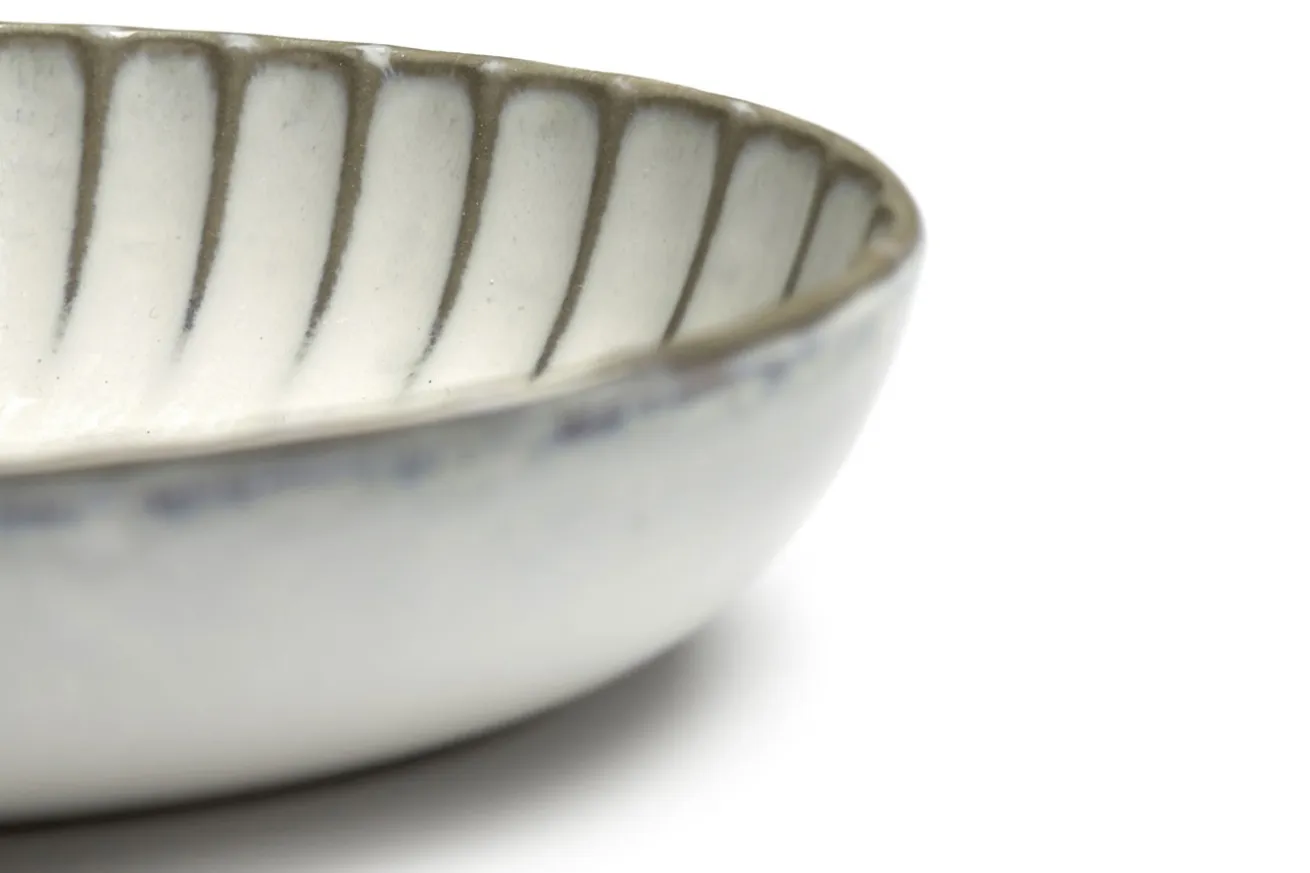 Einfach und doch speziell zugleich ist diese Schüssel aus der Inku-Kollektion von Serax. Weißes Steingut mit dunklem Rand. Feine Linien erstrecken sich gleichmäßig und verklingen zur Mitte hin. So setzen sie durch ihre Filigranität den Fokus auf die Speise. Das einfache Design sowie Farbe erinnern an Muscheln, Blumen und andere in der Natur vokommende, unvollkommene Formen.