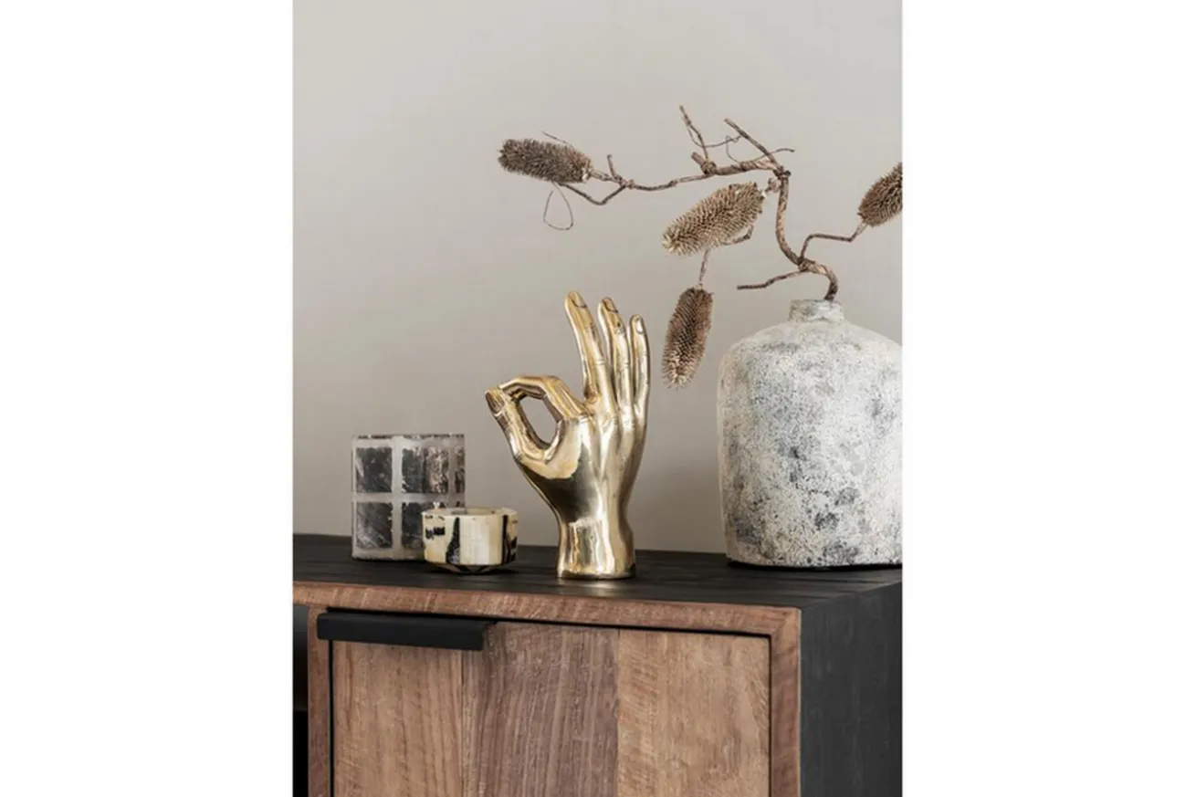 Im Sideboard Cosmo gibt es viel Platz für alles, was der Haushalt hergibt. Hinter den vier Teakholz Türen können Sie alles verschwinden lassen, was nicht unbedingt präsentiert werden muss. Die Metallablage hingegen bietet eine offene Ablagefläche. ein ideales Möbelstück für den Flur oder das Speisezimmer.