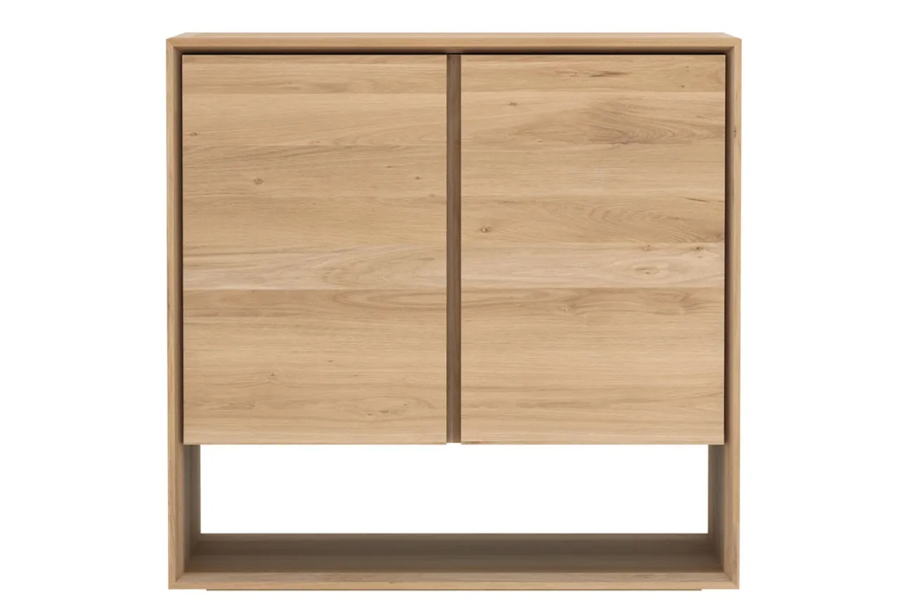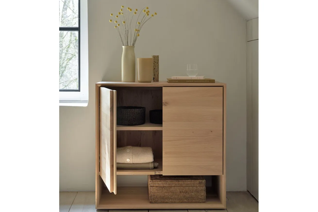 Die Design Anrichte besteht aus natürlichem Eichenholz mit gleichmäßiger Maserung, dessen Oberfläche geölt wurde. Das 2-türige Möbelstück bietet viel Stauraum an. Das im Hausbau sehr begehrte Holz wurde hier zu einem Möbelstück im Design Stil zusammengebaut. Das Board zeichnet sich zudem durch seine besondere Kante aus. Die abgeschrägten Kanten verleihen diesen Möbeln aus massiver Eiche eine sehr cleane Ausstrahlung.