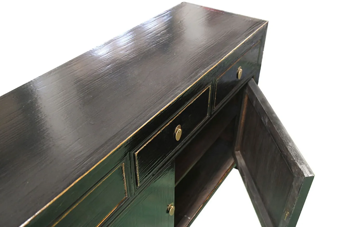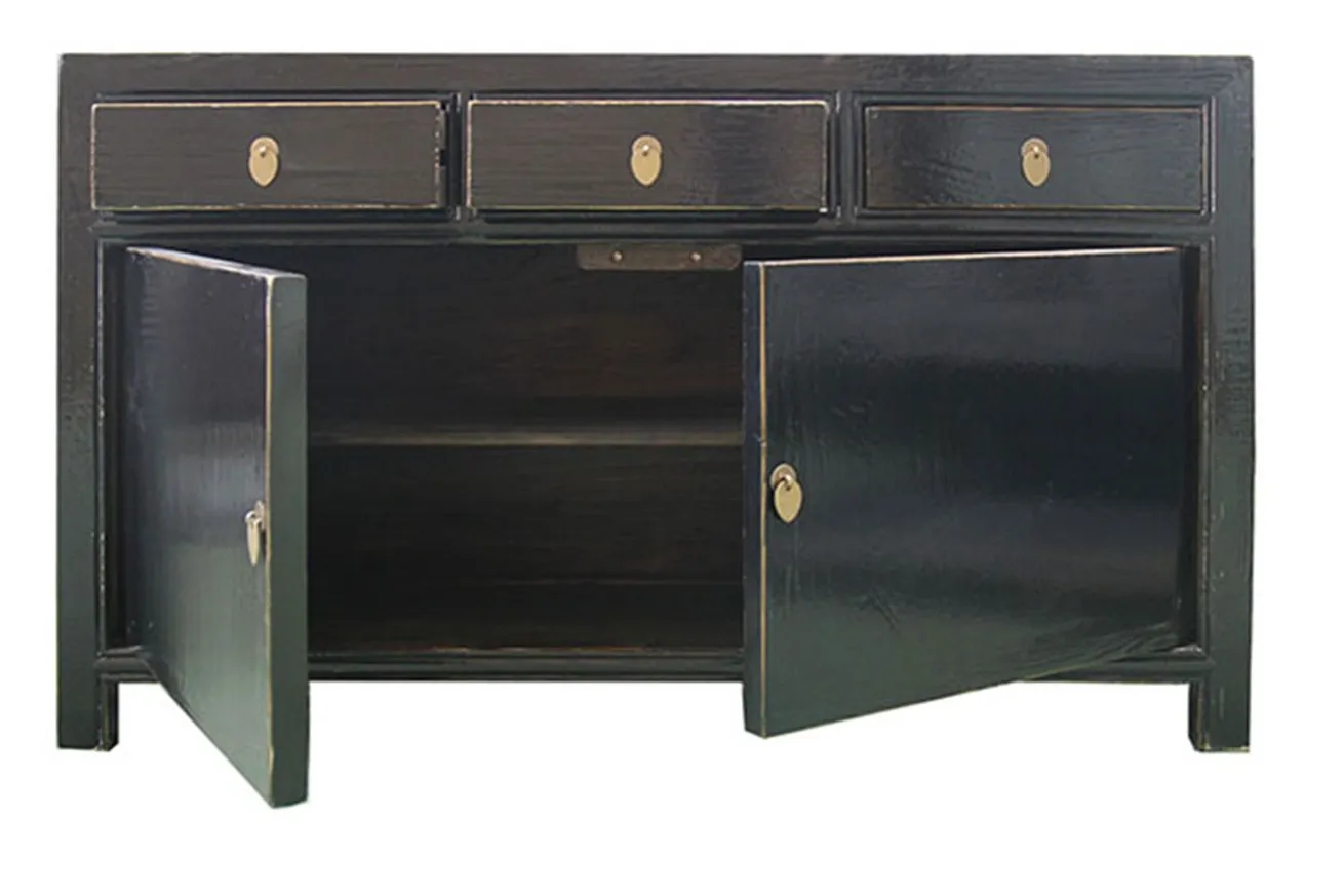 Dieses Sideboard bringt ein Stück fernöstliche Ästhetik in Ihr Zuhause! Gefertigt aus massivem Holz und in tiefem Schwarz lackiert, strahlt es zeitlose Eleganz und Ruhe aus. Die klaren Linien und das zurückhaltende Design machen es zu einem stilvollen Blickfang, während die goldenen Griffe für einen Hauch von Luxus sorgen. Die drei Schubladen bieten Platz für kleinere Gegenstände, während die beiden Türen mit dem zusätzlichen Einlegeboden reichlich Stauraum für größere Dinge schaffen. Perfekt für das Wohnzimmer, den Flur oder das Esszimmer – dieses Sideboard ist nicht nur ein Möbelstück, sondern ein Statement. Die Kombination aus edler, dunkler Lackierung und den warmen goldenen Akzenten verleiht ihm einen harmonischen Kontrast und macht es zum idealen Möbel für moderne sowie asiatisch inspirierte Einrichtungsstile.