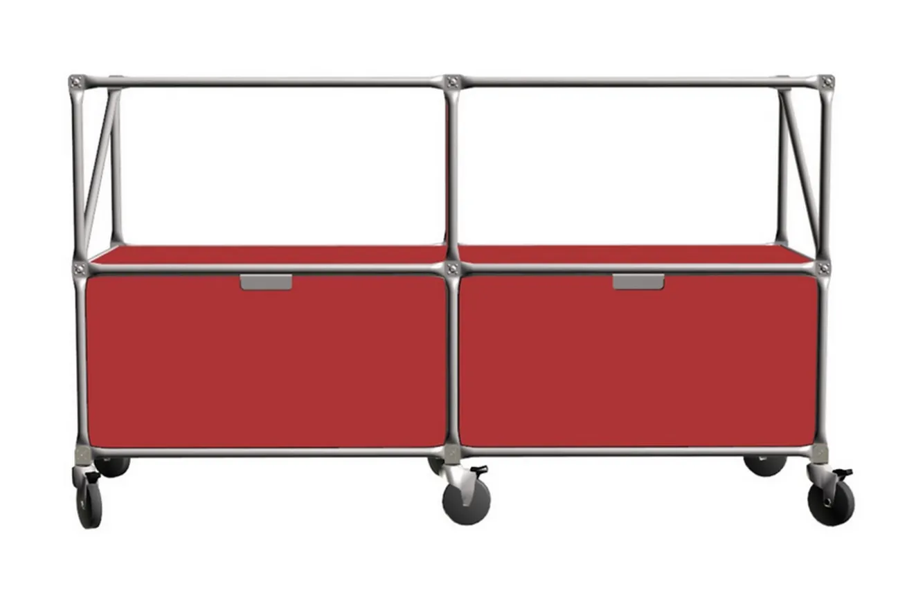 Das rote Sideboard der Marke System 180 ist 150cm breit, 89,5cm hoch und 47cm tief. Ein Edelstahlgestell trägt rote MDF-Platten und ausziehbare Schubladen, die genügend Stauraum für alles Mögliche bieten, seien es Tacker, Locher und Heftklammern oder aber wichtige Dokumente, die Sie auf die Oberflächen legen können. Hauptsache, im Büro herrscht Ordnung.