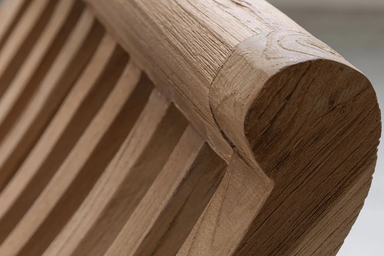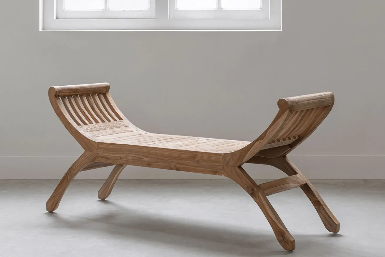 Bank, geschwungene angedeutete Lehnen, Teakholz, rustikal