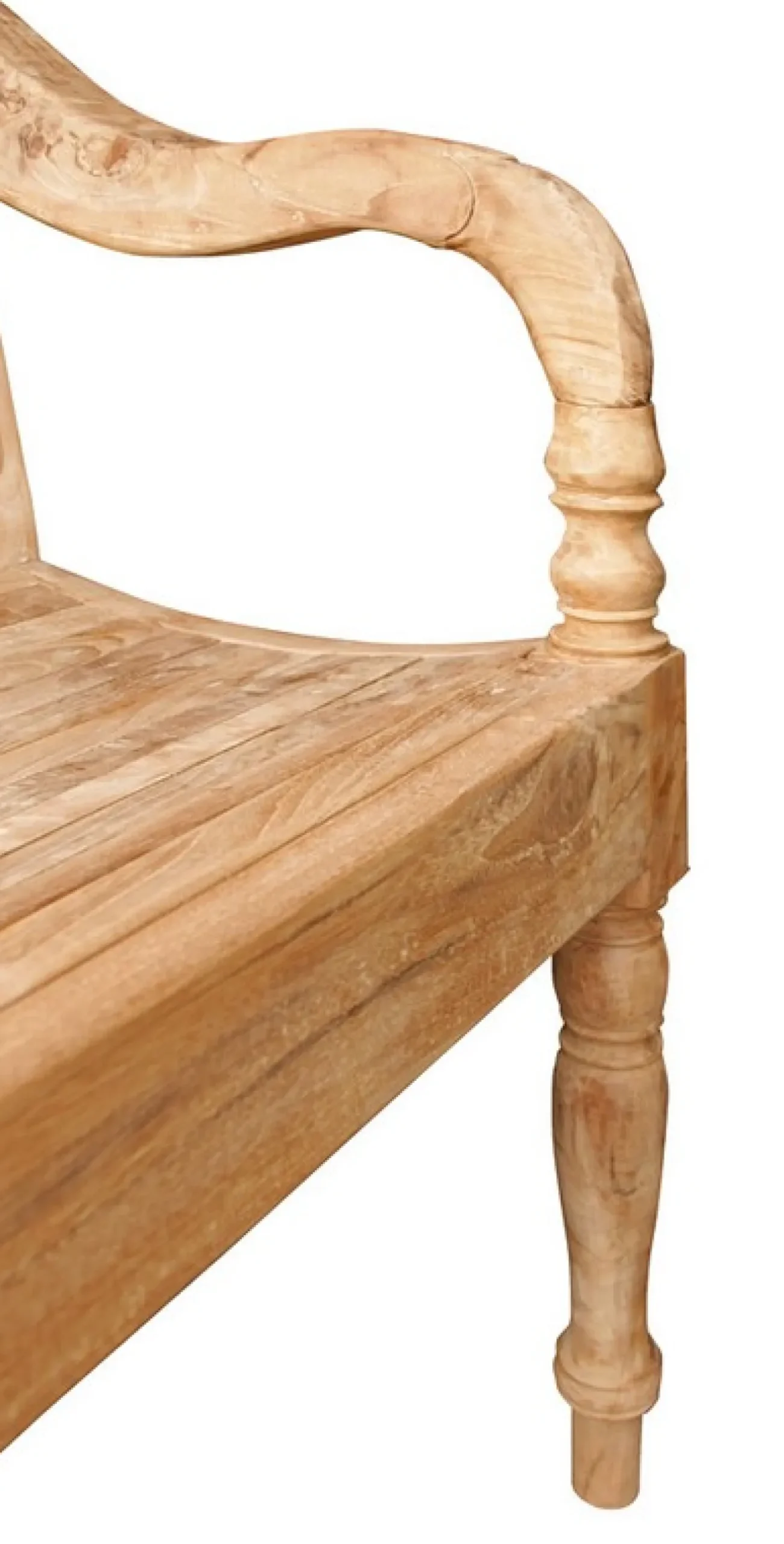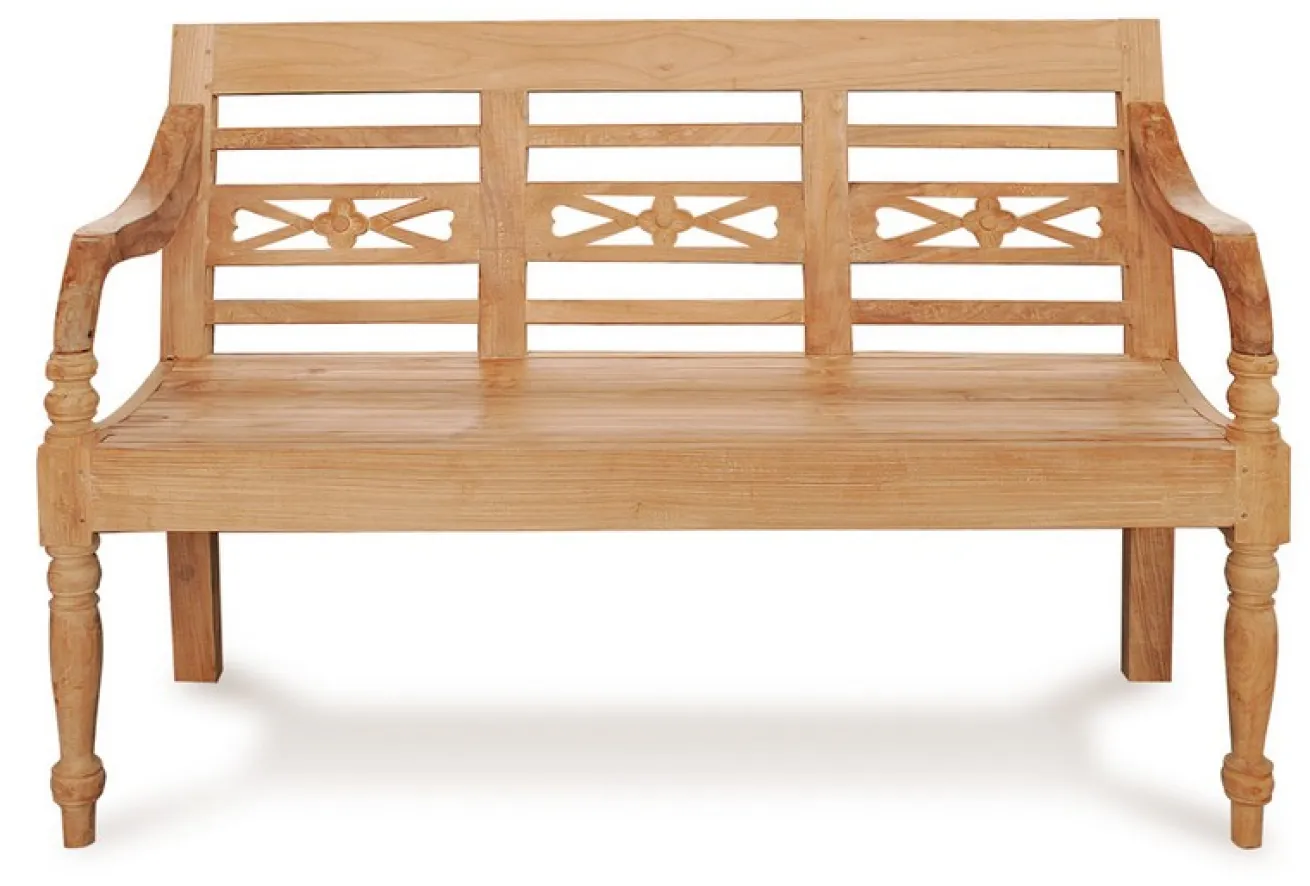 Wer auf der Suche nach einer naturfarbenen Bank aus Holz ist, der sollte bei diesem Modell nicht lange überlegen. Unsere aus recyceltem Teakholz gefertigte Bank ist eine wunderbare Sitzgelegenheit für drinnen und draußen! Mit einer Breite von 190cm, einer Höhe von 78cm und einer Tiefe von 45cm ist sie weder zu groß noch zu klein, um im Garten oder auch im Flur zu stehen. Dieses Massivholzmöbelstück hat eine unbehandelte Oberfläche und erstrahlt somit in seiner Naturfarbe. Die teilweise handgefertigte Bank überzeugt durch zwei verzierte Füße und ein handgeschnitztes Blumenmuster in der Lehne. Hauchen Sie Ihrem Garten oder Ihrem Wohnraum etwas mehr Gemütlichkeit a la Landhausstil mit dieser Sitzbank aus Teak ein.