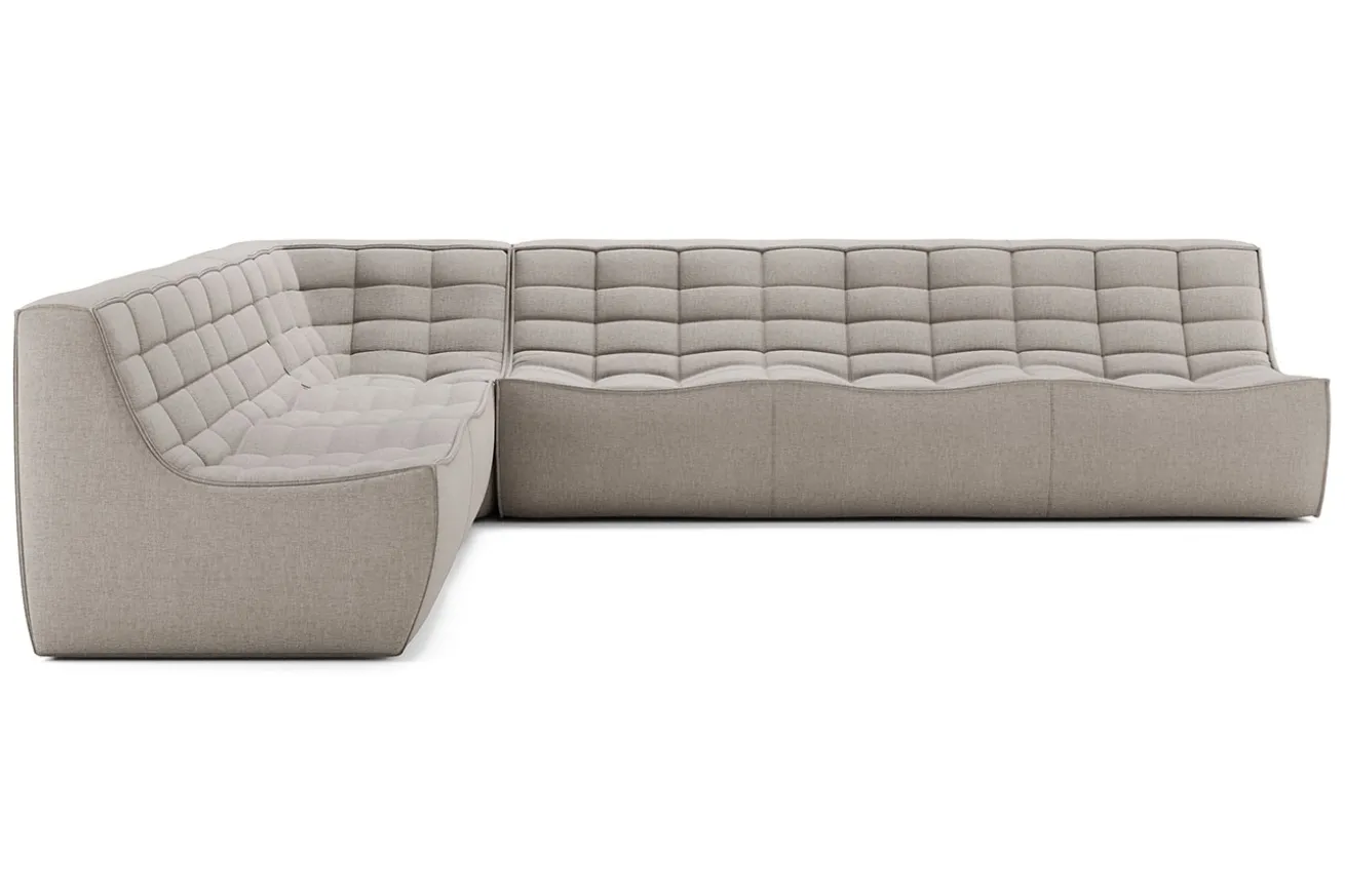 Diese großzügige Kombination aus der modularen N701 Serie besteht aus einem 2-Sitzer, einem 3-Sitzer und einer runden 90°-Ecke. Das Design stammt von Jacques Deneef und verbindet Komfort mit klarer Formsprache. Der helle Eco-Stoff in Ecru besteht aus recycelter Baumwolle und bringt eine ruhige, natürliche Atmosphäre in moderne Wohnbereiche.