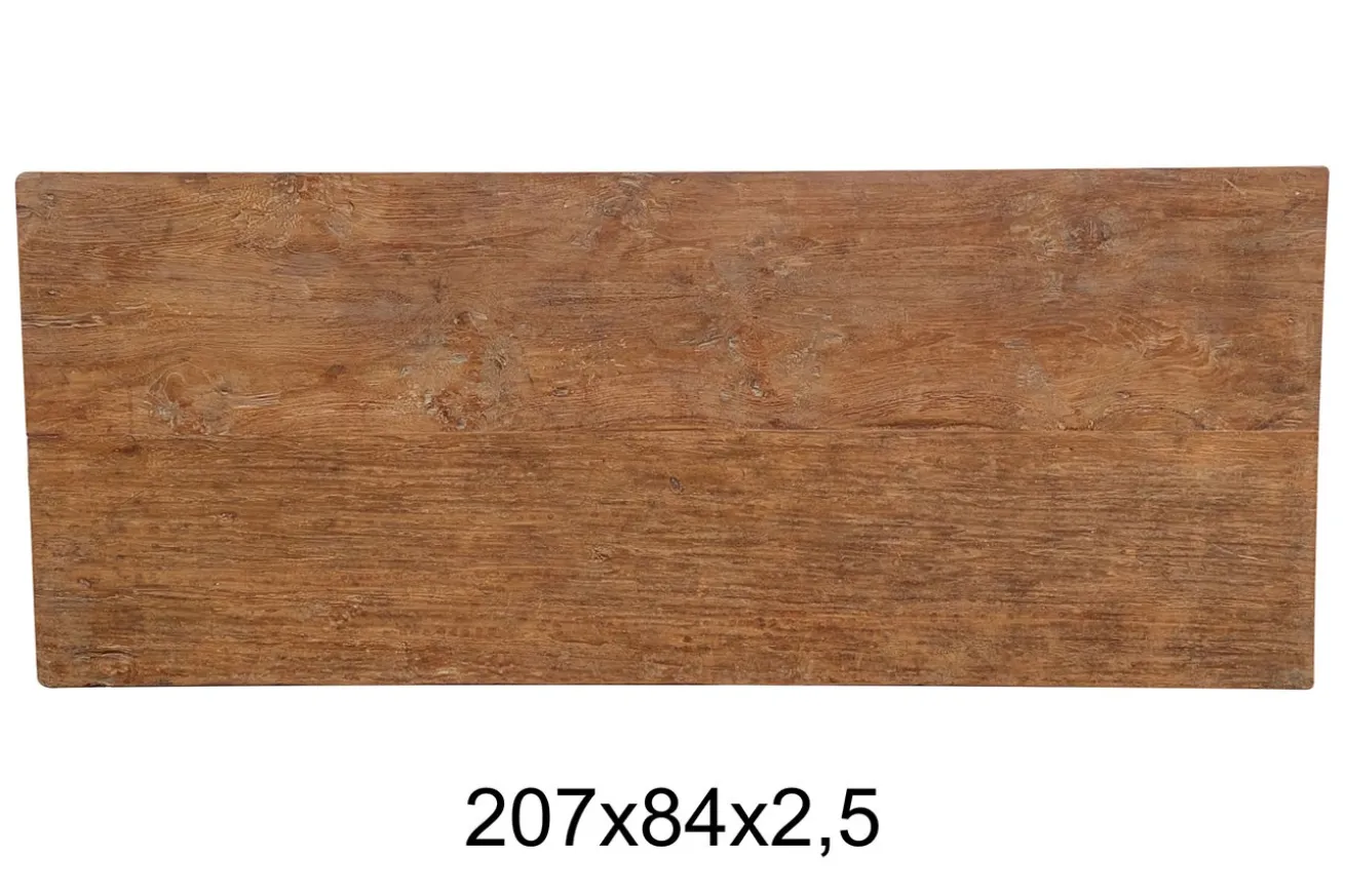 Außergewöhnliche Wohnräume verdienen Möbel, die nicht nur auffallen, sondern auch umweltfreundlich sind. Wie wäre es, wenn Sie Ihren zukünftigen Esstisch individuell gestalten? Wenn Sie etwas mit Geschichte suchen, das langlebig und stabil ist, empfehlen wir Ihnen unsere Tischplatte aus recyceltem Teakholz. Das charakteristische, dunkle Holz mit seiner tiefbraunen Farbe und fast schwarzen Maserung wird stets zum Blickfang. Die Farbe und die Oberfläche sind naturbelassen und unverarbeitet, wodurch die Tischplatte authentisch bleibt – hier hat die Natur allein das Werk geschaffen. Es gibt kaum etwas Nachhaltigeres als eine Tischplatte aus massivem Holz, deren natürliche Wuchsrichtung sowie Risse und Äste eine individuelle Schönheit entfalten. Die einzige Anpassung betrifft die gerade Kante, die ein harmonisches Sitzen ermöglicht. Trotz ihrer natürlichen Beschaffenheit lässt sich die Teakplatte mühelos reinigen. Besonders gut harmoniert sie mit Tischbeinen aus demselben Holz und passt perfekt in einen Landhausstil. Kombiniert mit kräftigen Farben kreieren Sie ein einladendes Ensemble, das die ganze Familie anzieht und zu geselligen Zusammenkünften einlädt.