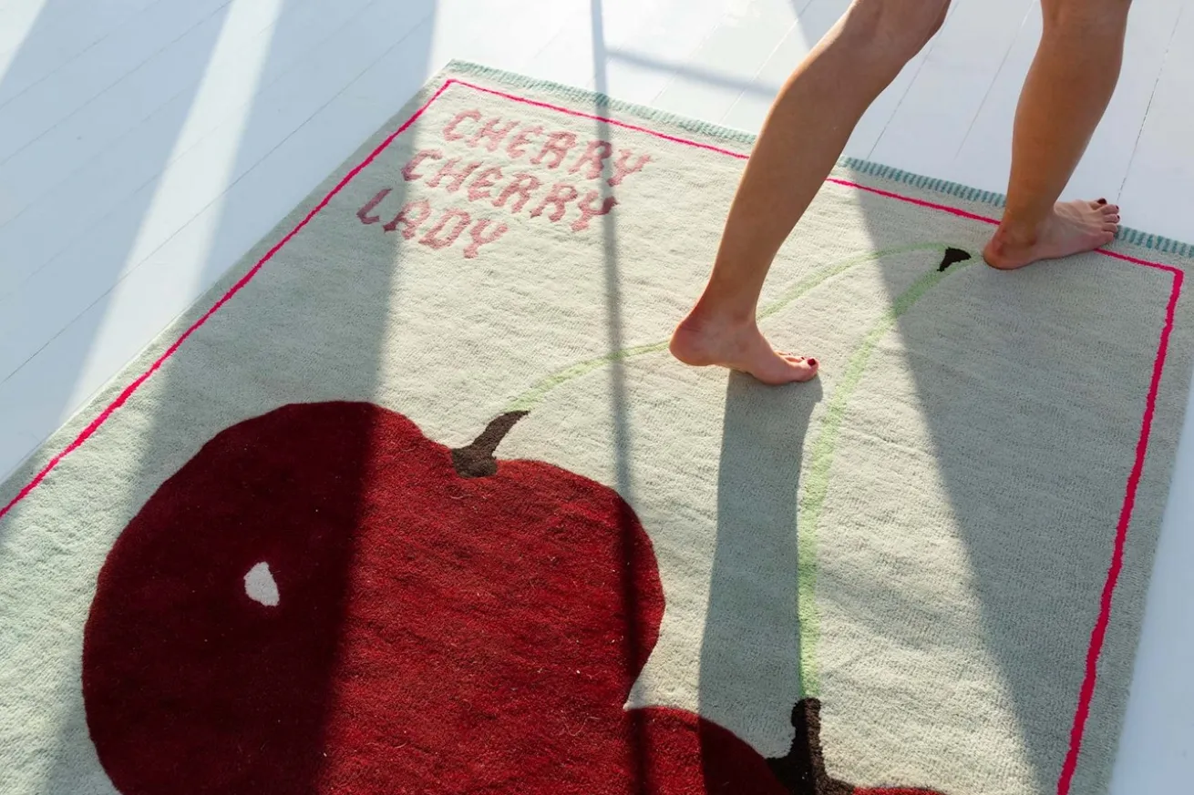 Bodenteppich, Motiv Kirsche, Farbe weiss rot, Handarbeit