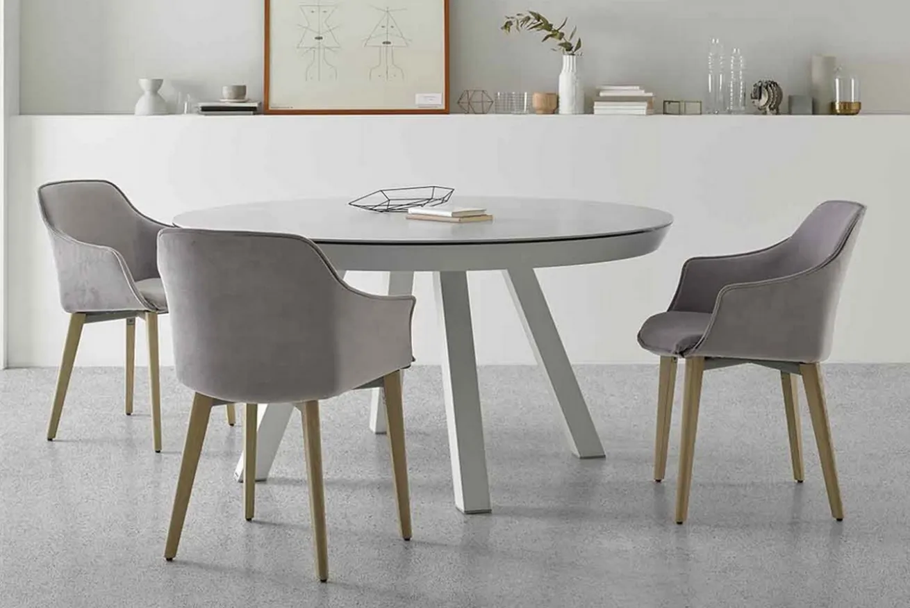 Wenn Sie Zweifel daran haben, dass all Ihre Freunde an Ihrem Geburtstag an diesem Tisch Platz nehmen können, dann liegen Sie ganz falsch. Denn bei diesem runden Produkt für Esszimmer und Küche handelt es sich um einen Tisch, der nicht aus Holz, dafür aber ausziehbar ist. Er hat einen Durchmesser von 125cm und nach dem Ausziehen 165cm sowie eine Höhe von 75cm. Das Produkt besteht aus vier weißen Metallbeinen, die eine Keramikplatte tragen. Diese lässt sich zur Seite schieben, so dass Sie einen Mittelteil herausziehen und so den Tisch verlängern können. Kein Problem für alle, die ab und zu einen größeren Esszimmertisch brauchen. Durch die schlichte Oberfläche lässt sich das Produkt mit farbigen Esszimmerstühlen kombinieren und passt nicht nur in Räumlichkeiten im Shabby Chic oder Landhausstil, sondern auch in moderne Milieus.