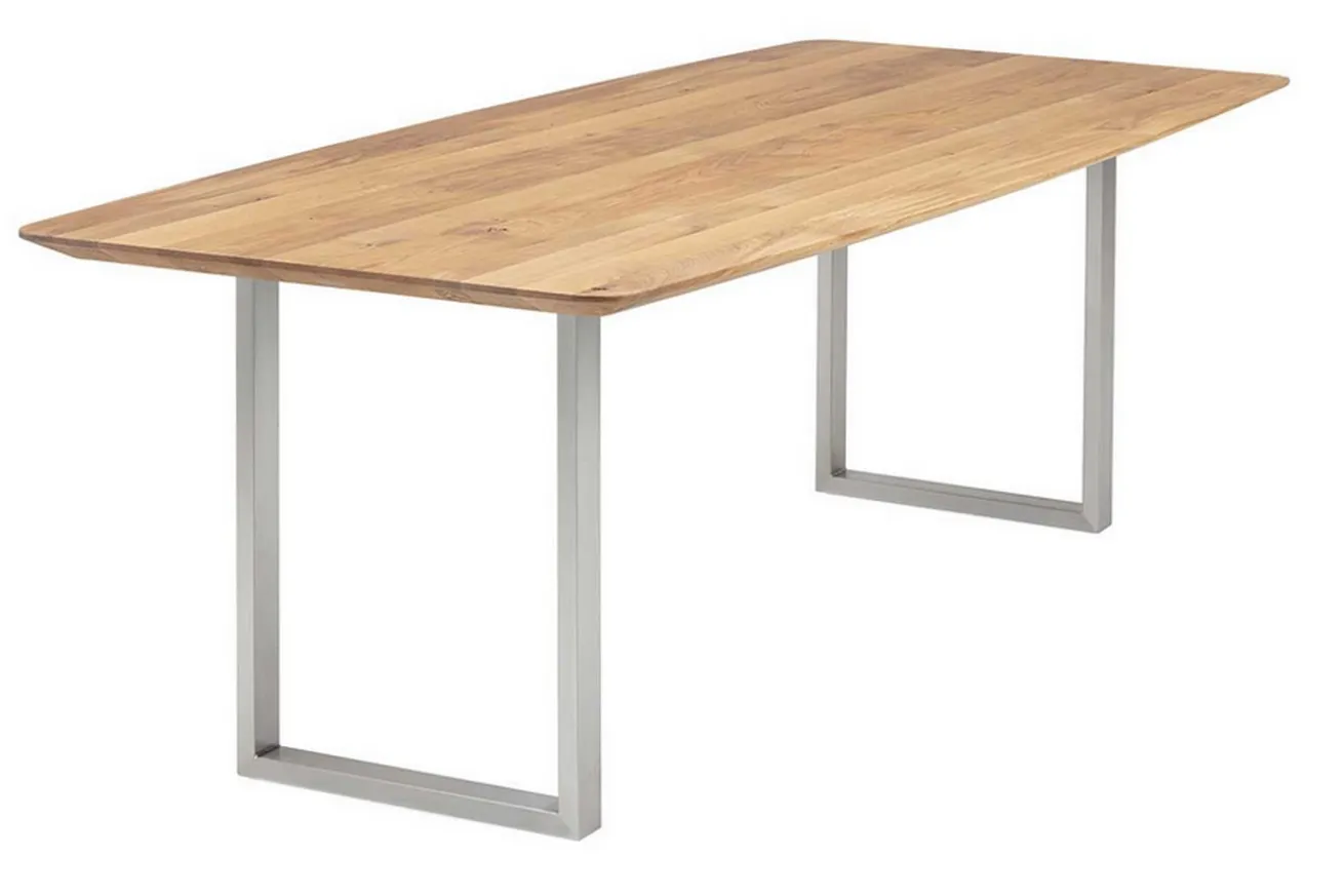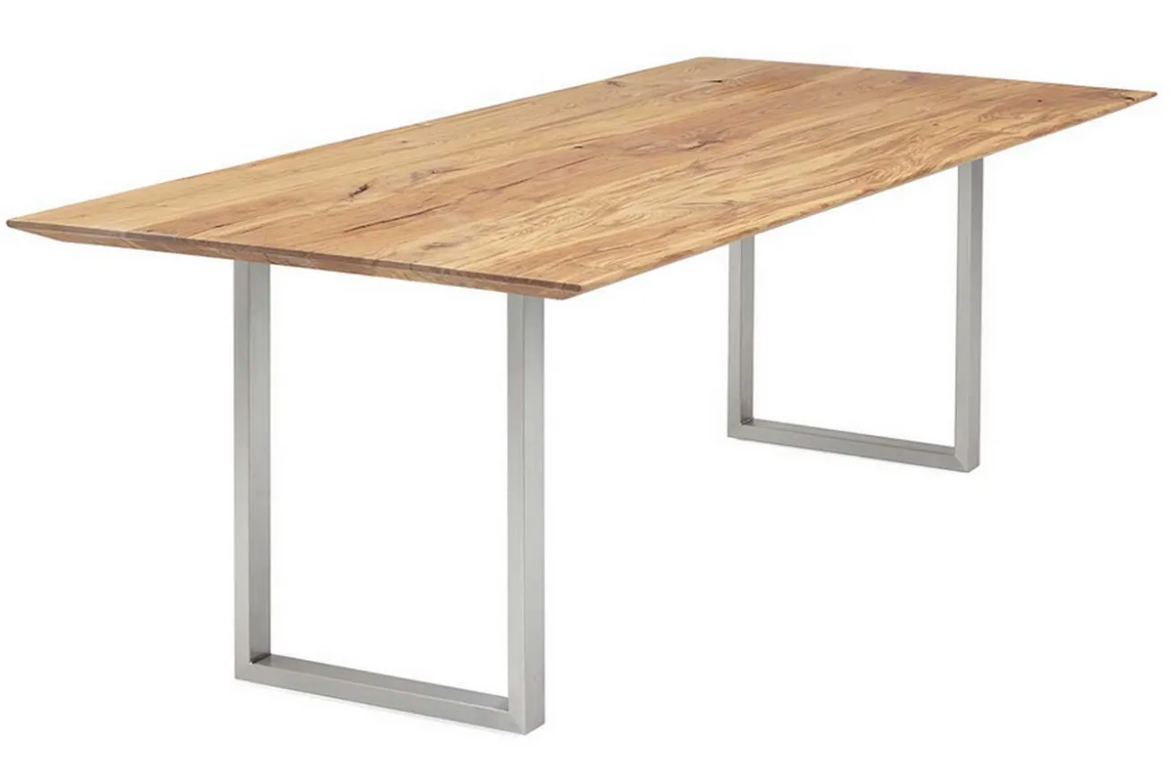 Hier ist Ihr moderner Esstisch! Dieser Tisch im nordischen Look überzeugt durch seine massive Eichenholzplatte, die von einem Tischgestell in feinem U-Profil aus Edelstahl getragen wird. Er hat die Maße Breite 140cm, Tiefe 90cm und Höhe 75cm. Die natürliche Farbe mit gleichmäßiger Maserung wird nicht nur dadurch unterstrichen, dass die Platte aus einzelnen Holzbohlen besteht, die aneinandergepresst dieses einzigartige Design ergeben, sondern auch dadurch, dass Äste und Risse offen sind, da die Oberfläche unbearbeitet ist. Durch die U-förmigen Beine wird die Natürlichkeit des Holzes unterstrichen. Besonders gut passen Möbel aus Eichenholz in Esszimmer im skandinavischem Stil und Milieus, die schlicht eingerichtet sind und den Fokus auf Naturmaterialien setzen.