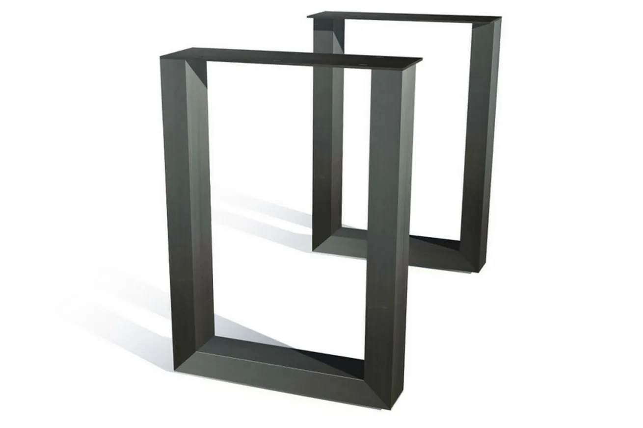 Dieser Fuß in U-Form ist aus dunkelgrau pulverbeschichtetem Stahl und hat eine Höhe von 73cm, eine Tiefe von 52,5cm sowie eine Breite von 16cm. Dieses Tischgestell passt zu leichten bis mittelschweren Tischplatten. Durch sein filigranes Aussehen wirkt jede Tischplatte als würde sie schweben.