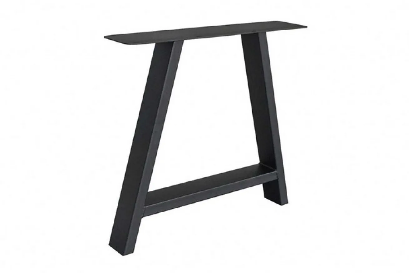 Das a-förmige Bein ist aus schwarz pulverbeschichtetem Metall. Es hat eine Breite von 78cm, eine Höhe von 72cm und eine Tiefe von 17cm. Die A-Form wird oben von einer Montageplatte zu einem Rechteck ergänzt und ermöglicht so einen einfacheren Zusammenbau von Platte und Fuß.